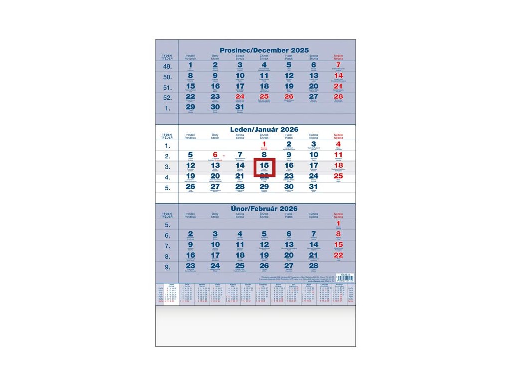 Nástěnný kalendář na rok 2026. V tomto kalendáři jsou zobrazeny tři měsíce na jednom listu. Vhodný k organizování různých událostí každodenního života. Možnost dotisku firemního loga a textu na spodní stranu kalendáře. TYP KALENDÁŘE: nástěnný Vazba: šitá, lepená Kalendárium: tříměsíční Rozměry: 315 x 420 mm Rozsah kalendáře: 12 listů Uvedená cena je za 1 ks.Dodatočné parametre