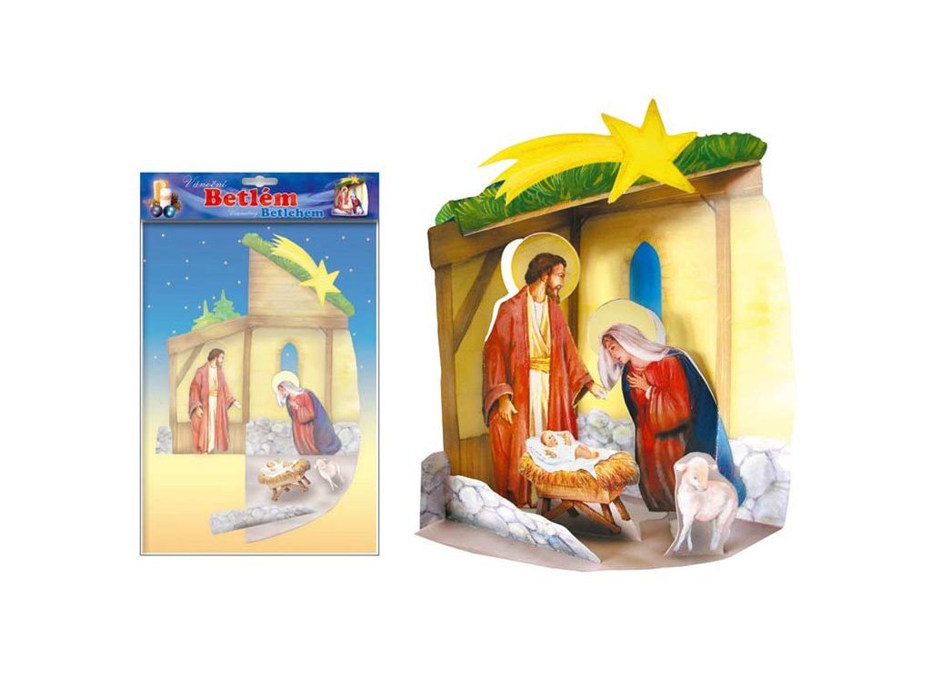 Poskladajte si papierový betlehem s Jozefom, Máriou a malým Ježiškom v jasličkách. Zostavenie je veľmi jednoduché a nepotrebujete k nemu žiadne nástroje. Betlehem má glitre a dá sa veľmi ľahko rozložiť a zase uschovať. Dodávame vo vrecúšku so závesom. Uvedená cena je za 1 ks.Dodatočné parametre
