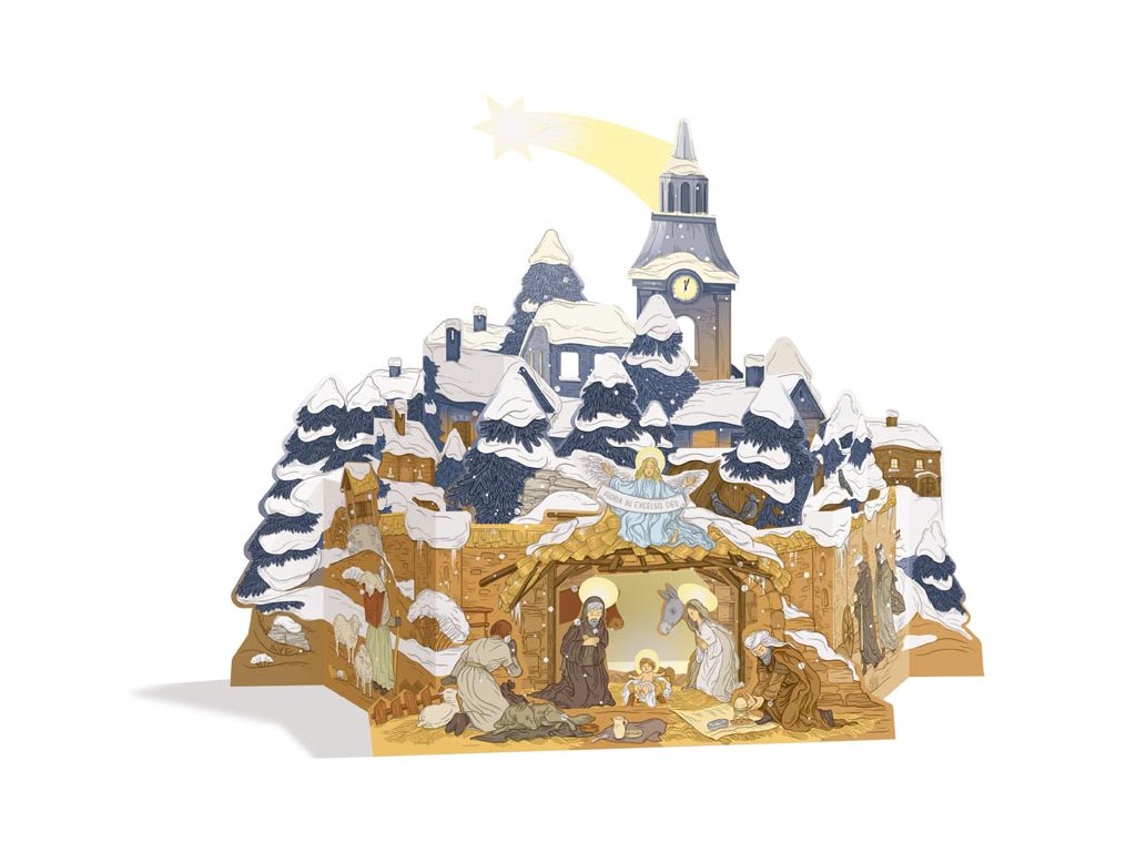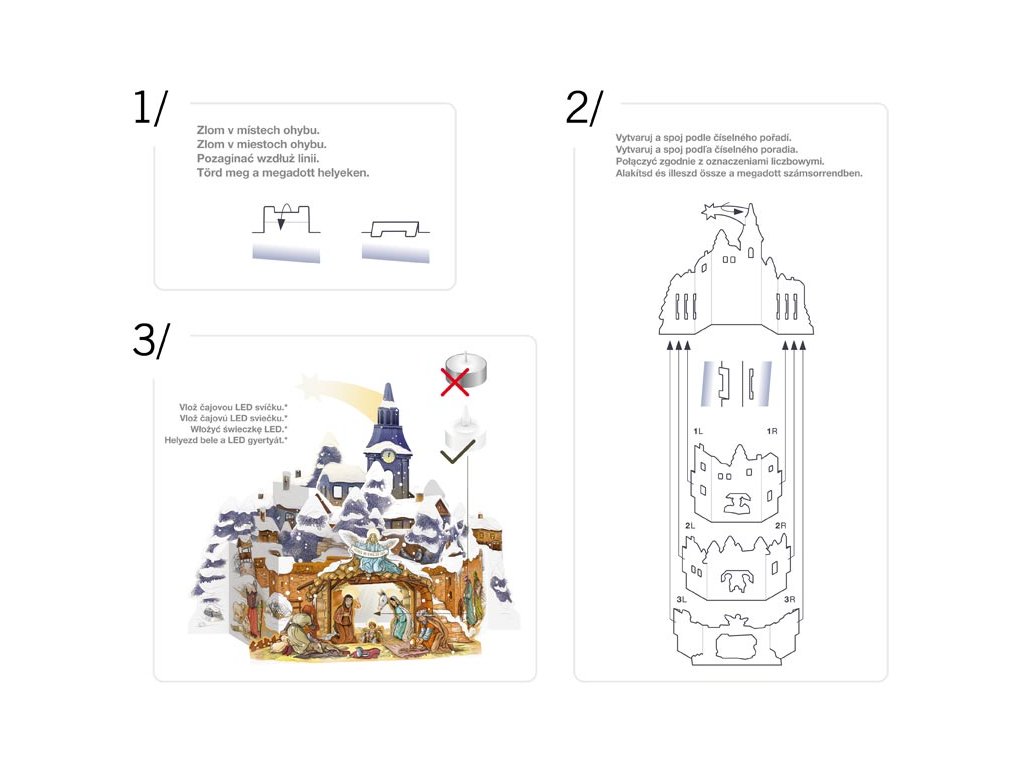 Skladací betlehem farebný z kartónu. Poskladajte si papierový betlehem s Jozefom, pannou Máriou a malým Ježiškom v jasličkách. Nájdete tu vyobrazené aj Tri Kráľa, alebo mudrcov z východu, Gašpara, Melichara a Baltazara. Zostavenie je veľmi jednoduché a nepotrebujete k nemu žiadne nástroje. Betlehem sa skladá zo 4 dielov a ide veľmi ľahko rozložiť a zase uschovať. Do betlehemu môžete vložiť čajovú elektrickú sviečku, ktorá dodá betlehemu tú pravú vianočnú atmosféru. POZORr: použitie iba s LED sviečkou na batérie (max. 3V) Na zadnej strane balenia je návod na zostavenie betlehemu. Sviečka nie je súčasťou balenia. Betlehem je zabalený v sáčku. Uvedená cena je za 1 ks.Dodatočné parametre