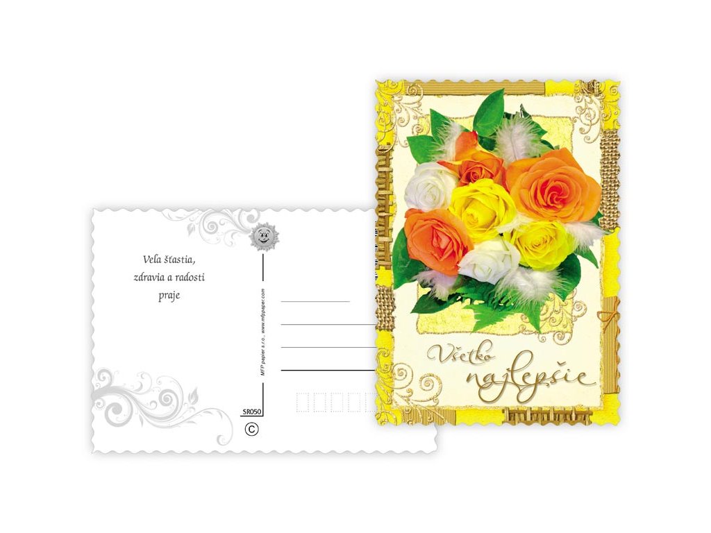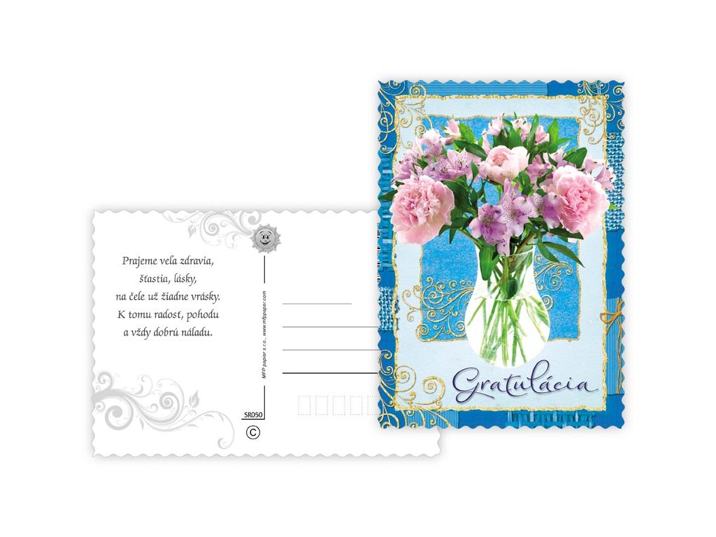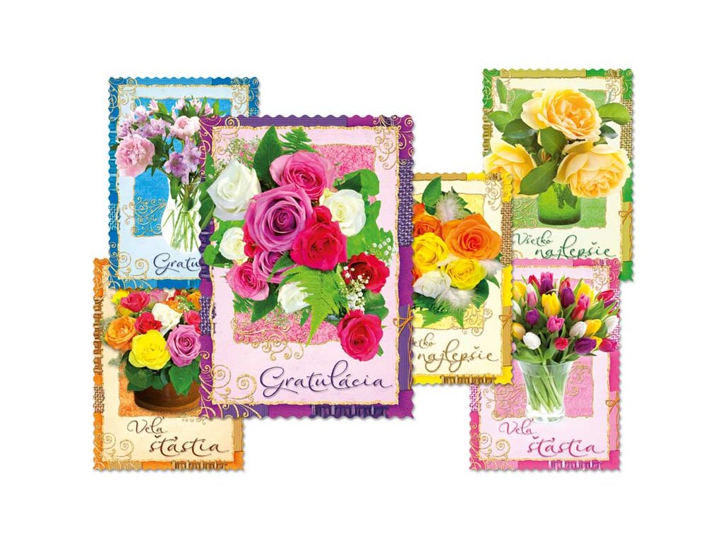 Pohľadnica s obrázkami kvetín a vlnitým rámom. Text obsahuje na zadnej strane 6 pohľadníc zo 6. Text na prednej strane: Gratulácia, Veľa šťastia, Všetko najlepšie Text na zadnej strane: Pohľadnica 1: Srdečné blahoželanie ku krásnemu sviatku, veľa šťastia, zdravia a spokojnosti Pohľadnica 2: Všetko najlepšie, veľa šťastia, lásky a spokojnosti želá Pohľadnica 3:Prajeme veľa zdravia, šťastia, lásky, na čele už žiadne vrásky. K tomu radosť, pohodu a vždy dobrú náladu. Pohľadnica 4: Všetko najlepšie a veľa krásnych dní želá Pohľadnica 5: Veľa šťastia, zdravia a radosti želá Pohľadnica 6: Nech je krásny nielen dnešný deň, ale aj všetky ostatné v roku Papier: pohľadnicový kartón 240 g Povrchová úprava: bez laku s výrezom Text: 6/6 Uvedená cena je za 1 ks. Dodávame v mixe po 6 ks podľa skladových zásob.Dodatočné parametre