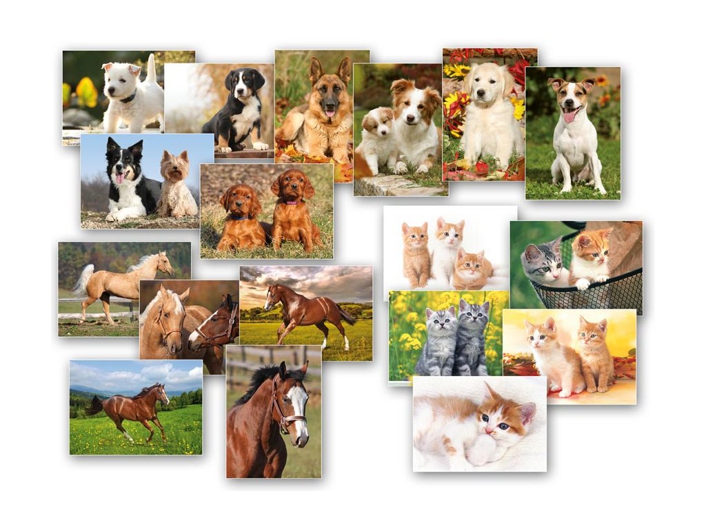Mix 24 ks pohľadníc zvierat z kolekcií Z018, Z033, Z036, Z037. Nájdete tu obrázky psov, mačiek a koní. Papier: pohľadnicový kartón 240 g Povrchová úprava: UV lak Text: 0/6 Uvedená cena je za 1 ks pohľadnice.Dodatočné parametre