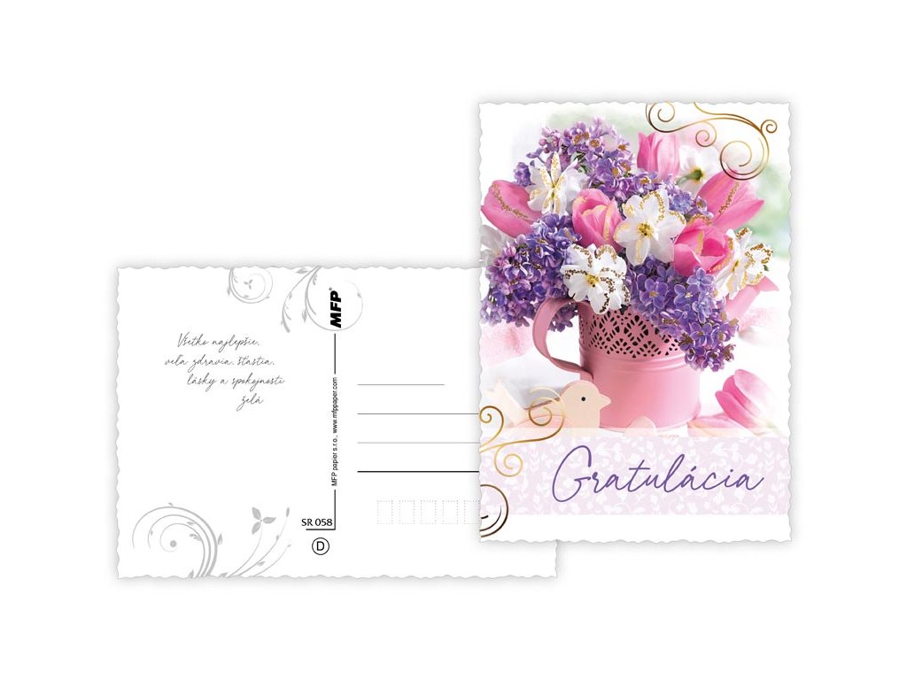 SK pohľadnica s obrázkami kvetín a vlnitým rámom. Text obsahuje na zadnej strane 6 pohľadníc zo 6. Text na prednej strane: Gratulácia, veľa šťastia, blahoželanie Text na zadnej strane: Pohľadnice 1: Srdečné blahoželanie ku krásnemu sviatku. Veľa šťastia a spokojnosti. Pohľadnice 2: Všetko najlepšie a veľa krásnych dní praje Pohľadnice 3: Všetko najlepšie. Veľa zdravia, lásky a spokojnosti praje Pohľadnice 4: Prajeme veľa zdravia, šťastia, lásky, na čele už žiadne vrásky. K tomu radosť, pohodu a vždy dobrú náladu. Pohľadnice 5: Nech je krásny a nielen dnešný deň, ale i všetky ostatné v roku. Pohľadnice 6: Veľa šťastia, zdravia a radosti praje. Papier: pohľadnicový kartón 240 g Povrchová úprava: bez laku s výsekom Text: 6/6 Dodávame v mixe po 6 ks podľa skladových zásob. Uvedená cena je za 1 ks.Dodatočné parametre