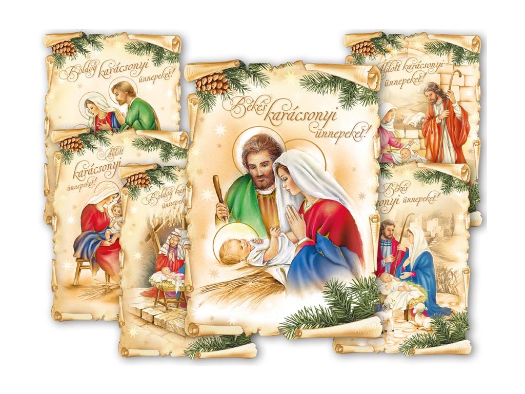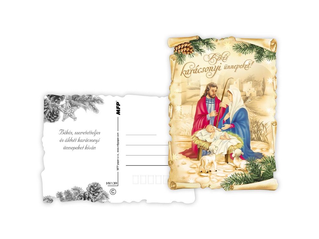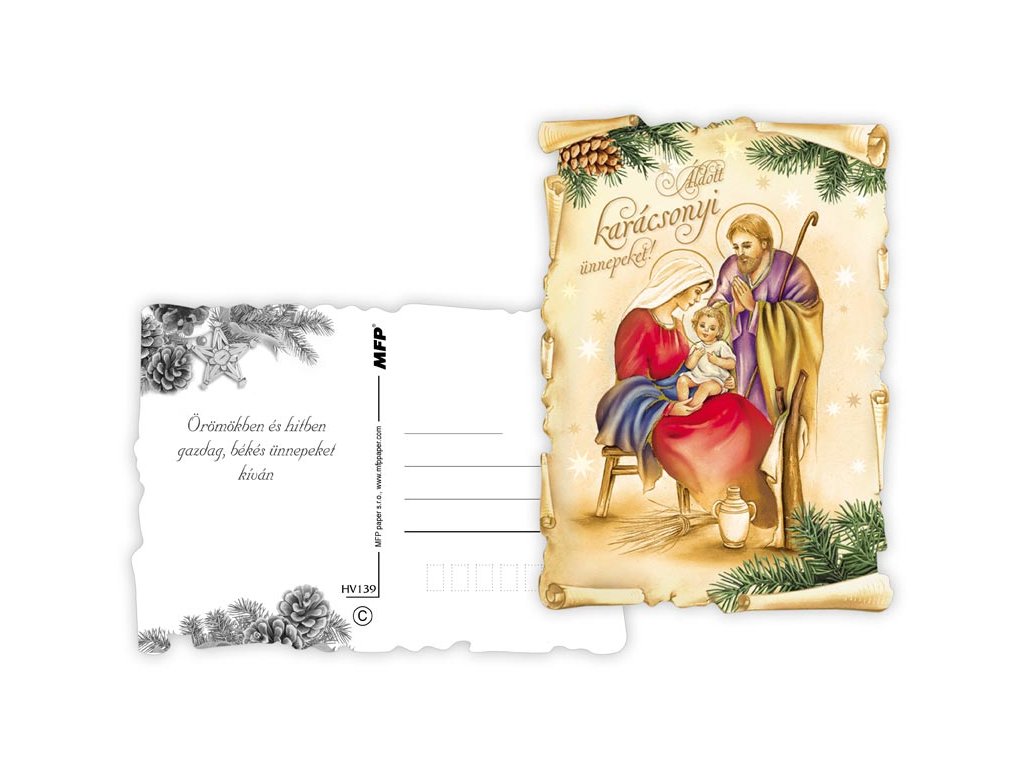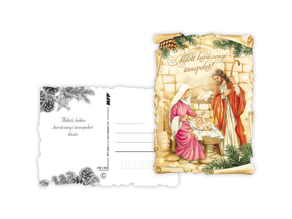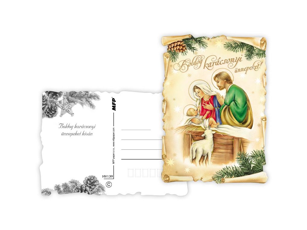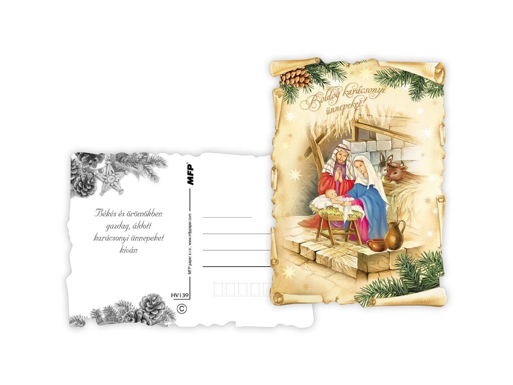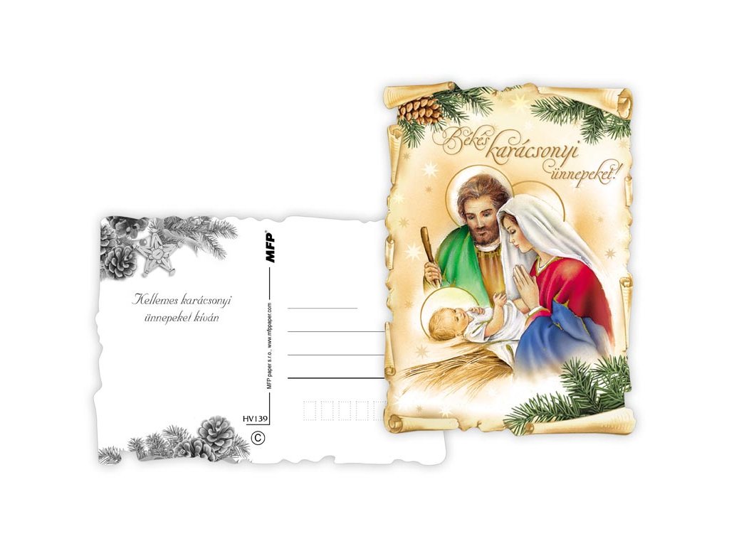 Pohľadnica s vianočným motívom. Séria 6 motívov s textom. Dodávame v mixe podľa skladových zásob. Na prednej strane je maďarský text. Rozmery: A6 10,5 x 14,8 cm Papier: pohľadnicový kartón 240 g Povrchová úprava: bez laku s výsekom Text: 6/6 Uvedená cena je za 1 ks.Dodatočné parametre