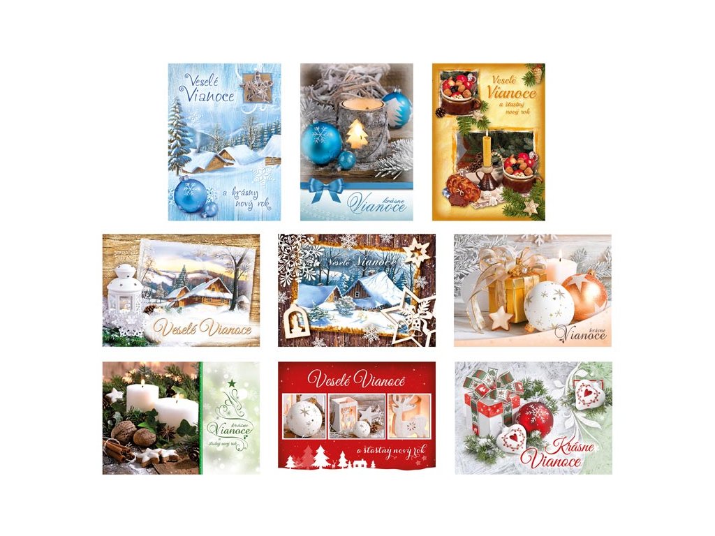 Pohľadnice s vianočným motívom. Text obsahuje 9 pohľadníc zo 9. Text na prednej strane: Veselé Vianoce a krásny nový rok, Veselé Vianoce a šťastný nový rok, Veselé Vianoce, Krásne Vianoce, Krásne Vianoce a šťastný nový rok, Veselé Vianoce a šťatsný nový rok, Text vo vnútri: Pohľadnica 1: Krásne Vianoce, veľa šťastíčka a zdravíčka v novom roku praje Pohľadnica 2: Krásne Vianoce a nový rok plný šťastia, zdravia a lásky praje Pohľadnica 3: Pokojné prežitie vianočných sviatkov, veľa šťastia, zdravia a mnoho úspechov v novom roku praje Pohľadnica 4: Šťastné a veselé Vianoce a veľa darčekov, radosti a prekvapení pod vianočným stromčekom praje Pohľadnica 5: Pokojné prežitie vianočných sviatkov, veľa šťastia, zdravia a mnoho úspechov v novom roku praje Pohľadnica 6: Krásne Vianoce a veľa šťastíčka a zdravíčka v novom roku praje Pohľadnica 7: Pokojné prežitie vianočných sviatkov, veľa šťastia, zdravia a mnoho úspechov v novom roku praje Pohľadnica 8: Krásne Vianoce a nový rok plný šťastia, zdravia a lásky praje Pohľadnica 9: Krásne Vianoce, veľa šťastíčka a zdravíčka v novom roku praje Papier: pohľadnicový kartón 240 g Povrchová úprava: Text: 9/9 Dodávame v mixe podľa skladových zásob. Uvedená cena je za 1 ks.Dodatočné parametre
