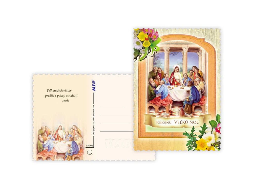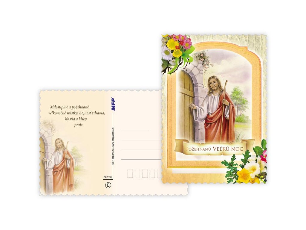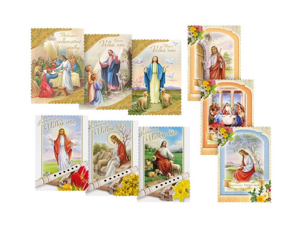 Pohľadnica s veľkonočným motívom. Text obsahuje 9 pohľadníc zo 9. Text na prednej strane: Požehnané vel'konočné sviatky, Krásnu Vel'ku noc, Pokojnú Vel'kú noc, Požehnanú Vel'kú noc, Text vo vnútri: Pohľadnica 1: Vel'konočnej sviatky prežité v pokoji a radosti praje Pohľadnica 2: Požehnané vel'konočné sviatky, nádej z Kristovho víťazstva, hojnosť zdravia a síl vyprosuje Pohľadnica 3: Milostiplné a požehnané vel¨konočné sviatky, hojnosť zdravia, šťastia a lásky praje Pohľadnica 4: Víťazstvo vel'konočnej nedele, nech nás posilní a naplní pokojom a dôverou. Pohľadnica 5: Sviatky plné milosti a požehnania od vzkrieseného Spasitel'a s láskou želá Pohľadnica 6: Vo svetle tohoto radostného posolstva nech je slávenie Vel'kej noci prameňom nádeje, radosti a pokoja. Pohľadnica 7: Sviatky plné milosti a požehnania od vzkrieseného Spasitel'a s láskou želá Pohľadnica 8: Požehnané vel'konočné sviatky, nádej z Kristovho víťazstva, hojnosť zdravia a síl vyprosuje Pohľadnica 9: Vel'konočné sviatky prežité v pokoji a radosti praje Papier: pohľadnicový kartón 240 g Povrchová úprava: UV lak, výsek Text: 9/9 Dodávame v mixe podľa skladových zásob. Uvedená cena je za 1 ks.Dodatočné parametre