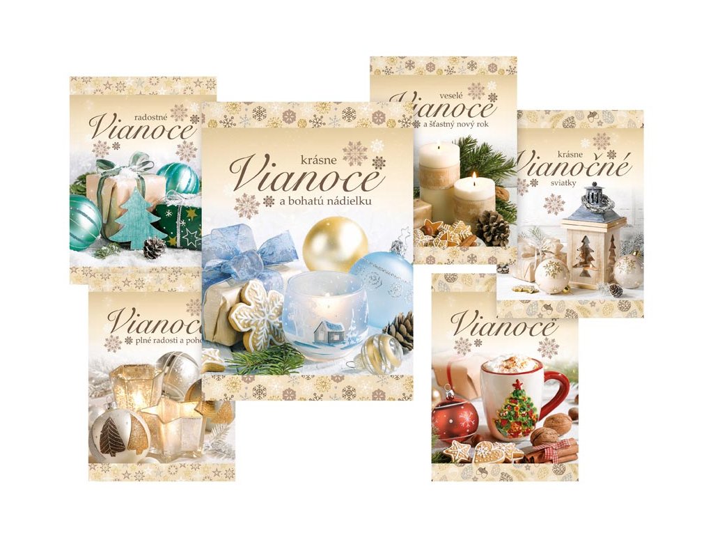 Pohľadnica s vianočným motívom. Text na zadnej strane obsahujú 6 pohľadnice zo 6. Text na prednej strane: Krásne Vianoce a bohatú nádielku, Vianoce plné radosti a pohody, Radostné Vianoce, Veselé Vianoce a šťastný nový rok, Krásne Vianočné sviatky, Čarovné Vianoce Text na zadnej strane: Pohľadnica 1: Šťastné a veselé Vianoce, veľa darčekov, radosti a prekvapení pod vianočným stromčekom praje Pohľadnica 2: Pokojné prežitie vianočných sviatkov, veľa šťastia, zdravia a mnoho úspechov v novom roku praje Pohľadnica 3: Pokojné prežitie vianočných sviatkov a v novom roku všetko dobré praje Pohľadnica 4: Aby do celého domu prenikla pokojná vianočná atmosféra a vydržala po celý rok praje Pohľadnice 5: Krásne Vianoce a nový rok plný šťastia, zdravia a lásky praje Pohľadnice 6: Krásne Vianoce, veľa šťastíčka a zdravíčka v novom roku praje Papier: pohľadnicový kartón 240 g Povrchová úprava: bez úpravy Text: 6/6 Dodávame v mixe po 6 ks podľa skladovej zásoby. Uvedená cena je za 1 ks.Dodatočné parametre