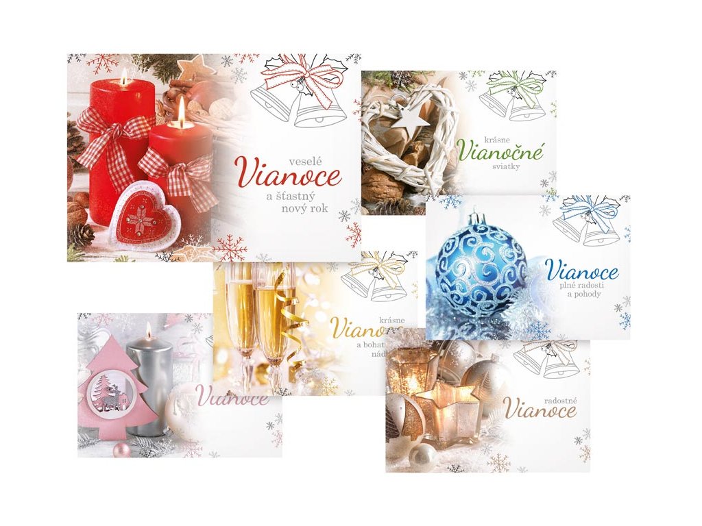 Pohľadnica s vianočným motívom. Text na zadnej strane obsahujú 6 pohľadnice zo 6. Text na prednej strane: Veselé Vianoce a šťastný nový rok,Vianoce plné radosti a pohody, Krásne Vianočné sviatky, Radostné Vianoce, Krásne Vianoce a bohatú nádielku, Veselé Vianoce Text na zadnej strane: Pohľadnica 1: Pokojné vianočné sviatky naplnené radosťou a požehnaný nový rok praje Pohľadnica 2: Vianočné sviatky prežité v pokoji a radosti z Ježíšovho narodenia praje Pohľadnica 3: Pokojné vianočné sviatky naplnené radosťou a požehnaný nový rok praje Pohľadnica 4: Pokojné vianočné sviatky naplnené radosťou a požehnaný nový rok praje Pohľadnice 5: Vianočné sviatky prežité v pokoji a radosti z Ježíšovho narodenia praje Pohľadnice 6: Aby do celého domu prenikla pokojná vianočná atmosféra a vydržala po celý rok praje Papier: pohľadnicový kartón 240 g Povrchová úprava: bez úpravy Text: 6/6 Dodávame v mixe po 6 ks podľa skladovej zásoby. Uvedená cena je za 1 ks.Dodatočné parametre