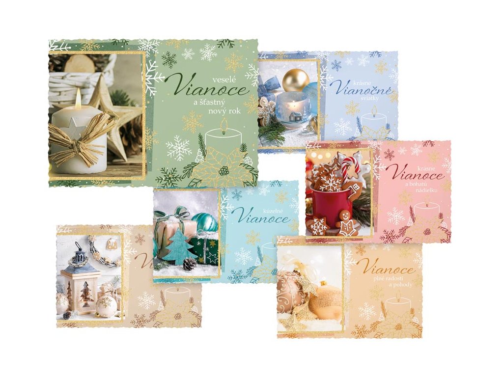 Pohľadnica s vianočným motívom. Text na zadnej strane obsahujú 6 pohľadnice zo 6. Text na prednej strane: Veselé Vianoce a šťastný nový rok, Krásne Vianoce a bohatú nádielku, Krásne Vianočné sviatky, Vianoce plné radosti a pohody kúzelné Vianoce, Veselé Vianoce Text na zadnej strane: Pohľadnica 1: Šťastné a veselé Vianoce, veľa darčekov, radosti a prekvapenia pod vianočným stromčekom praje Pohľadnica 2: Pokojné prežitie vianočných sviatkov, veľa šťastia, zdravia a mnoho úspechov v novom roku praje Pohľadnica 3: Pokojné prežitie vianočných sviatkov a v novom roku všetko dobré praje Pohľadnica 4: Aby do celého domu prenikla pokojná vianočná atmosféra a vydržala po celý rok praje Pohľadnice 5: Krásne Vianoce a nový rok plný šťastia, zdravia a lásky praje Pohľadnice 6: Krásne Vianoce, veľa šťastíčka a zdravíčka v novom roku praje Papier: pohľadnicový kartón 240 g Povrchová úprava: UV lak, výsek, gliter Text: 6/6 Dodávame v mixe po 6 ks podľa skladovej zásoby. Uvedená cena je za 1 ks.Dodatočné parametre