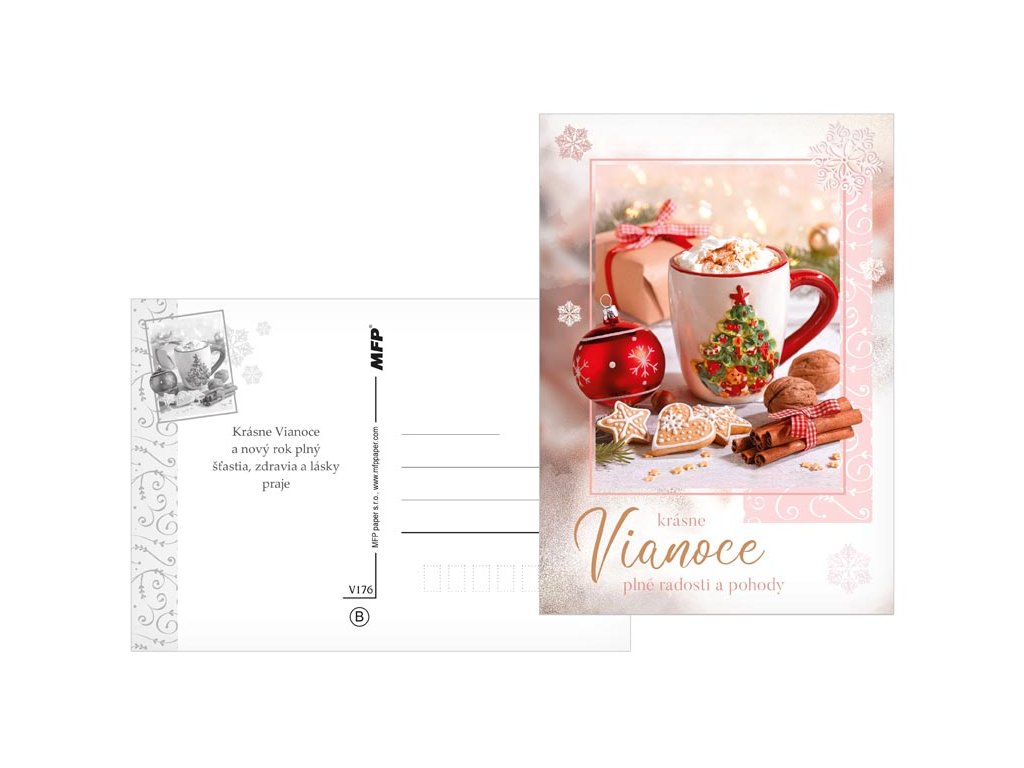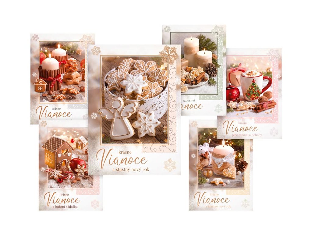 Pohľadnica v mixe vianočných motívov. Text obsahuje 6 pohľadníc zo 6. Text na prednej strane: krásne Vianoce, krásne Vianoce a bohatú nádielku, krásne Vianoce a šťastný nový rok, radostné Vianoce, krásne Vianoce plné radosti a pohody, krásne Vianoce a šťastný nový rok Text na zadnej strane: Pohľadnica 1:Šťastné a veselé Vianoce, veľa darčekov, radosti a prekvapení pod vianočným stromčekom praje Pohľadnica 2: Pokojné prežitie vianočných sviatkov, veľa šťastia, zdravia a mnoho úspechov v novom roku praje Pohľadnica 3: Pokojné prežitie vianočných sviatkov a v novom roku všetko dobré praje Pohľadnica 4: Aby do celého domu prenikla pokojná vianočná atmosféra a vydržala po celý rok praje Pohľadnice 5: Krásne Vianoce a nový rok plný šťastia, zdravia a lásky praje Pohľadnice 6: Krásne Vianoce, veľa šťastíčka a zdravíčka v novom roku praje Text: 6/6 Povrchová úprava: UV lak Papier: pohľadnicový kartón 240 g Dodávame v mixe po 6 ks podľa skladovej zásoby. Uvedená cena je za 1 ks.Dodatočné parametre