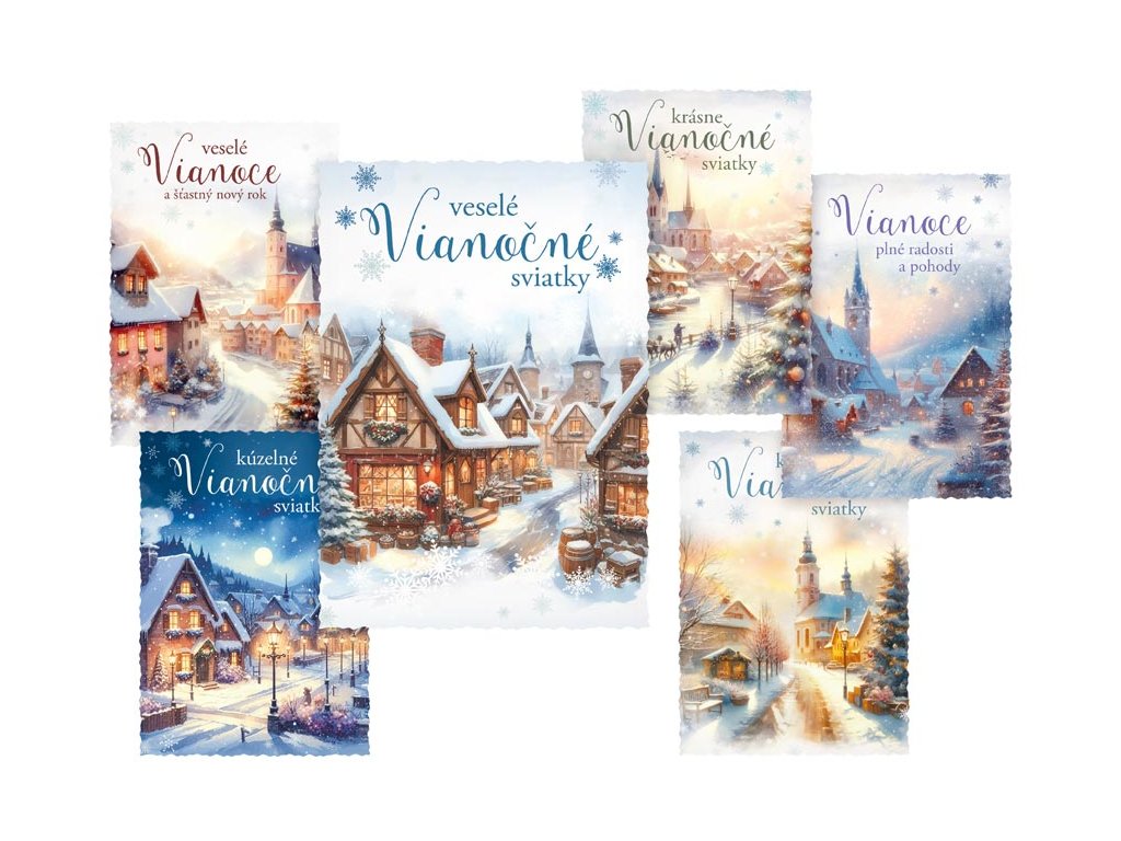 Pohľadnica v mixe vianočných motívov. Text obsahuje 6 pohľadníc zo 6. Text na prednej strane: veselé Vianoce a šťastný nový rok, kúzelné vianočné sviatky, veselé vianočné sviatky, krásne vianočné sviatky, Vianoce plné radosti a pohody, krásné vianočné sviatky Text na zadnej strane: Pohľadnica 1: Aby do celého domu prenikla pokojná vianočná atmosféra a vydržala po celý rok praje Pohľadnica 2: Šťastné a veselé Vianoce, veľa darčekov, radosti a prekvapení pod vianočným stromčekom praje Pohľadnica 3: Pokojné prežitie vianočných sviatkov, veľa šťastia, zdravia a mnoho úspechov v novom roku praje Pohľadnica 4: Pokojné prežitie vianočných sviatkov a v novom roku všetko dobré praje Pohľadnice 5: Krásne Vianoce a nový rok plný šťastia, zdravia a lásky praje Pohľadnice 6: Krásne Vianoce, veľa šťastíčka a zdravíčka v novom roku praje Text: 6/6 Papier: pohľadnicový kartón 240 g Povrchová úprava: UV lak s výsekom Dodávame v mixe po 6 ks podľa skladovej zásoby. Uvedená cena je za 1 ks.Dodatočné parametre