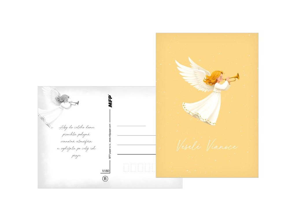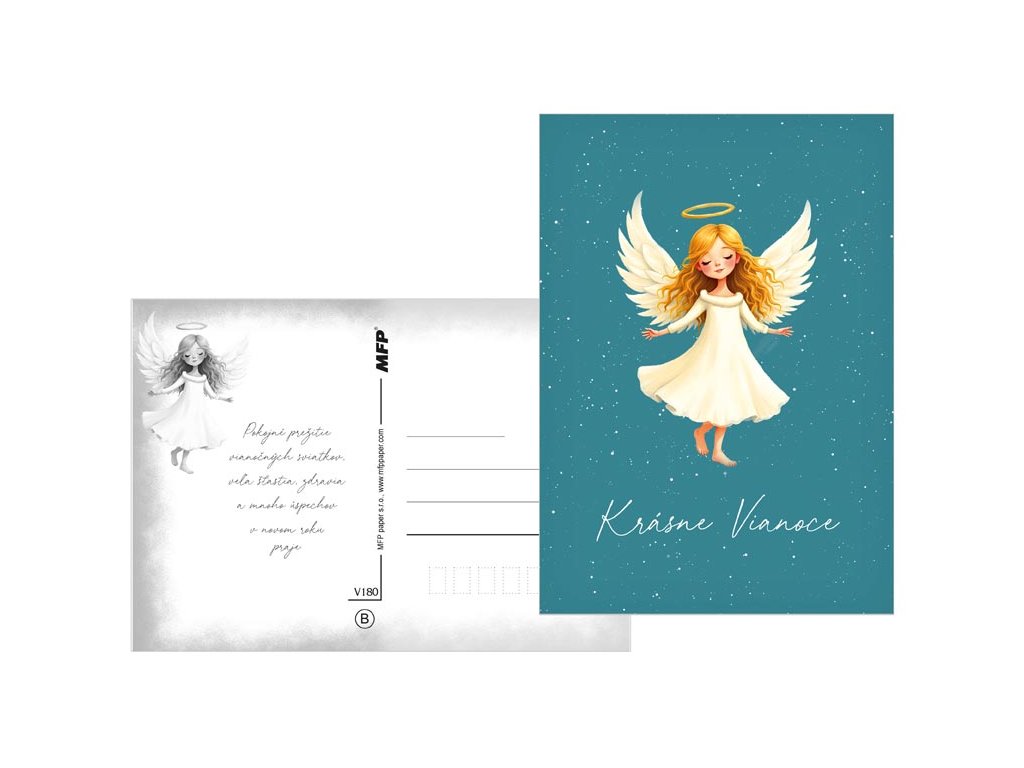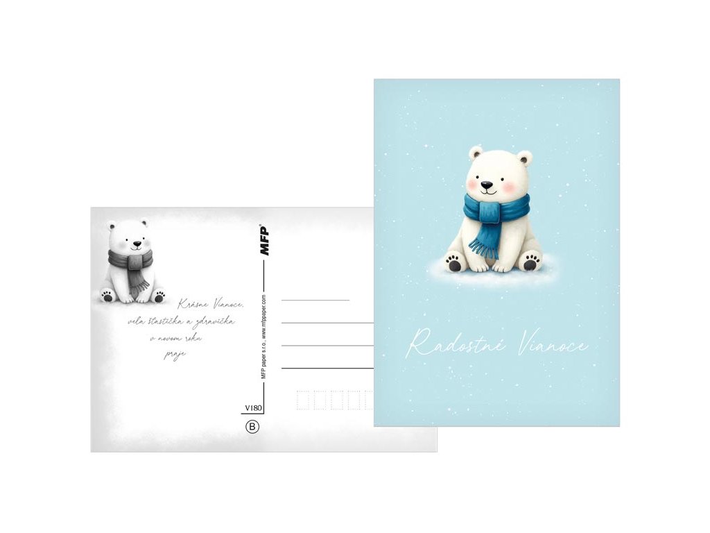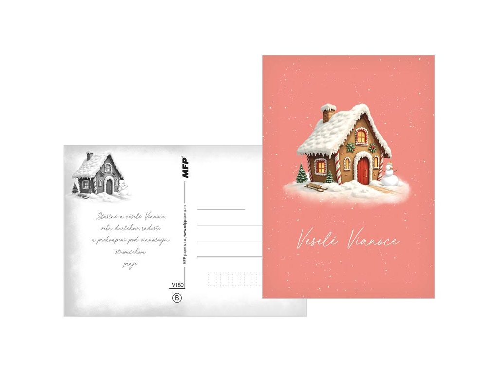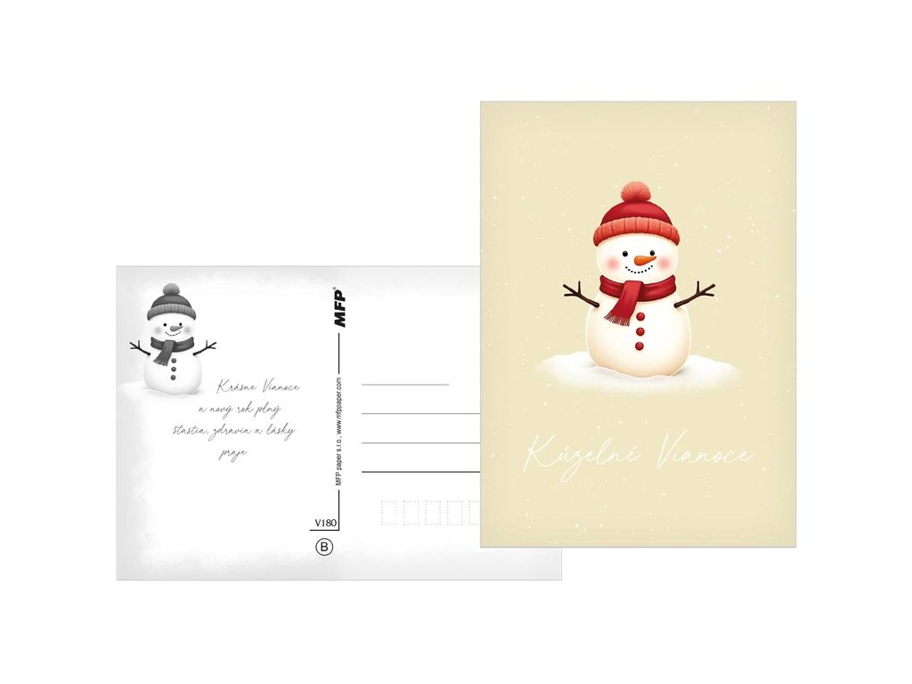 Pošlite sviatočný pozdrav s kúzlom! Potešte svojich blízkych krásnou vianočnou pohľadnicou, s ktorou im zaželáte radostné a pokojné sviatky. Na výber je niekoľko veselých zimných motívov – zasnežená chalúpka, vianočný stromček, snehuliak, anjelik alebo roztomilý ľadový medvedík. Ideálna na zaslanie sviatočného pozdravu , ktorý vyčarí úsmev a spríjemní vianočné chvíle. Text na prednej strane: Šťastné Vianoce, Krásne Vianoce, Veselé Vianoce, Radostné Vianoce, Veselé Vianoce, Kúzelné Vianoce Text na zadnej strane: Pohľadnica 1: Šťastné a veselé Vianoce, veľa darčekov, radosti a prekvapení pod vianočným stromčekom praje Pohľadnica 2: Pokojné prežitie vianočných sviatkov, veľa šťastia, zdravia a mnoho úspechov v novom roku praje Pohľadnica 3: Pokojné prežitie vianočných sviatkov a v novom roku všetko dobré praje Pohľadnica 4: Aby do celého domu prenikla pokojná vianočná atmosféra a vydržala po celý rok praje Pohľadnica 5: Krásne Vianoce a nový rok plný šťastia, zdravia a lásky praje Pohľadnica 6: Krásne Vianoce, veľa šťastíčka a zdravíčka v novom roku praje Text: 6/6 Povrchová úprava: UV lak Papier: pohľadnicový kartón 240 g Dodávame v mixe 6 motívov podľa skladových zásob. Uvedená cena je za 1 ks.Dodatočné parametre