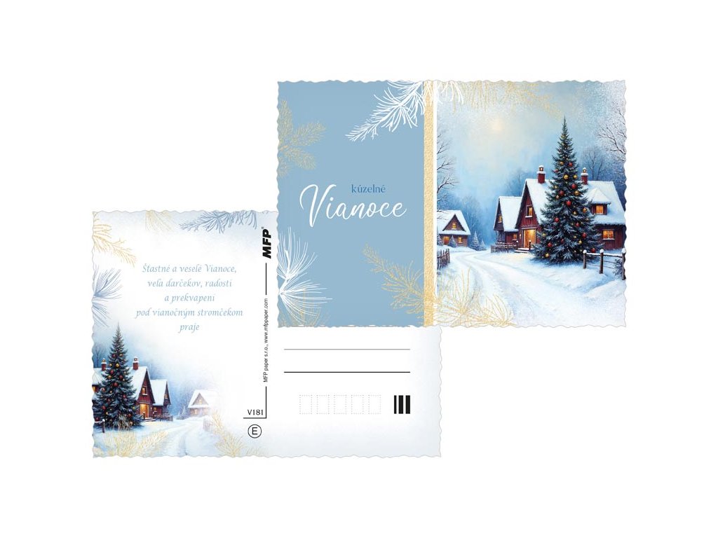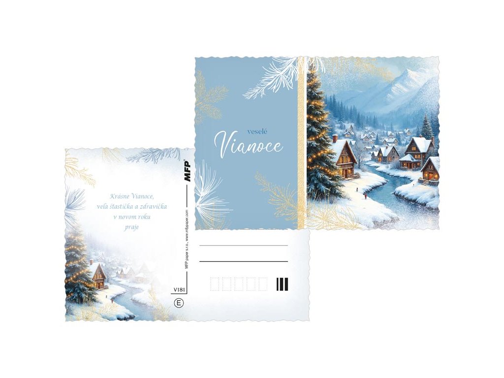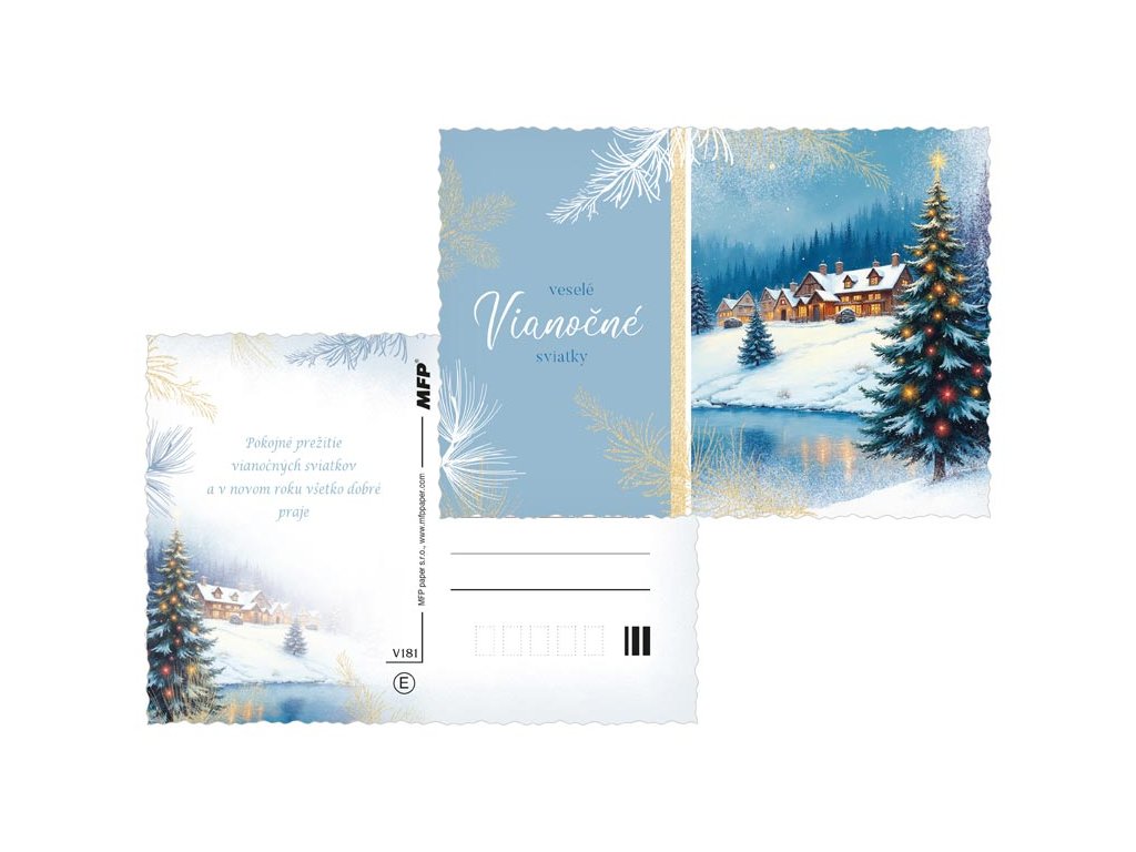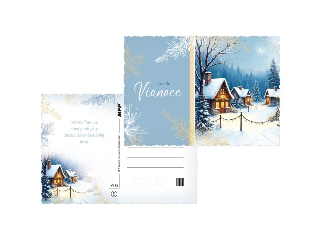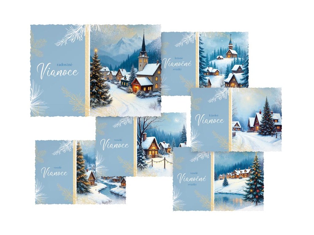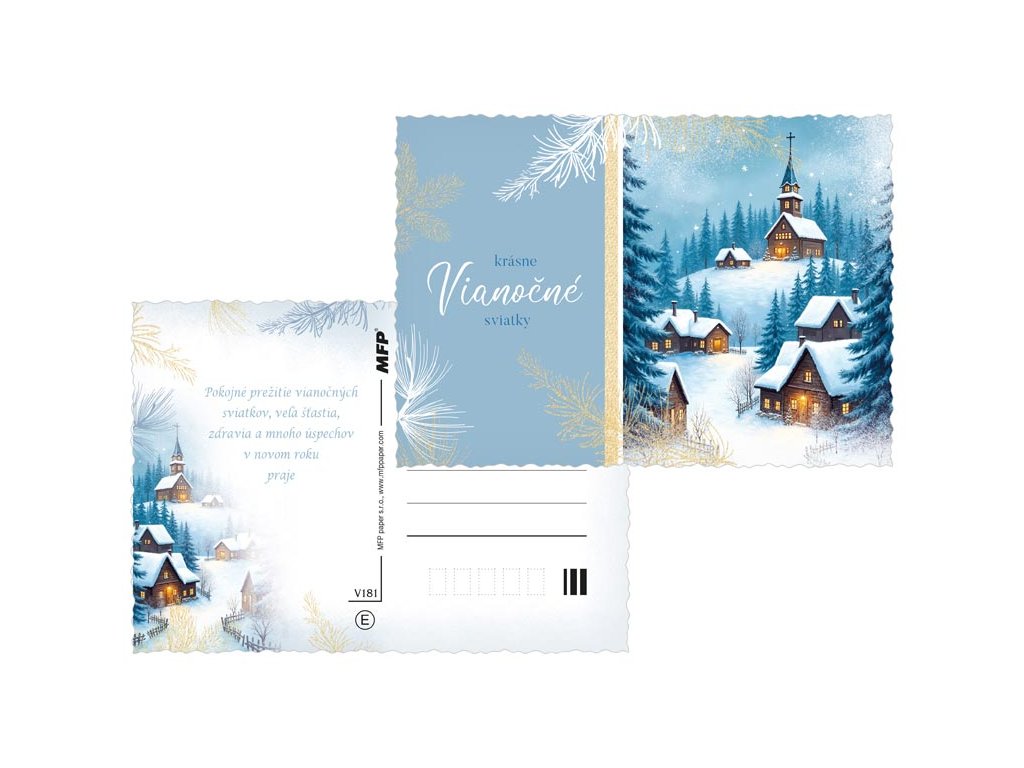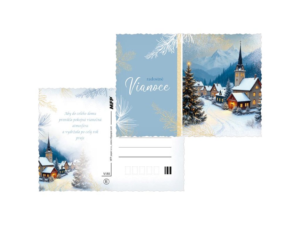 Prineste čaro tradičných Vianoc! Zaželajte pokojné a krásne sviatky originálnou vianočnou pohľadnicou s nádherným motívom zasneženej dedinky a kostolíka. Jemné ilustrácie zimnej krajiny s trblietajúcimi sa detailmi vytvárajú čarovnú atmosféru tradičných Vianoc. Ideálne na zaslanie sviatočného pozdravu, ktorý poteší a prenesie kúsok zimného kúzla priamo k adresátovi. Text na prednej strane: Radostné Vianoce, Veselé Vianoce, Krásne Vianoce, Veselé Vianoce, Kúzelné Vianoce, Veselé vianočné sviatky Text na zadnej strane: Pohľadnica 1: Aby do celého domu prenikla pokojná vianočná atmosféra a vydržala po celý rok praje Pohľadnica 2: Šťastné a veselé Vianoce, veľa darčekov, radosti a prekvapení pod vianočným stromčekom praje Pohľadnica 3: Pokojné prežitie vianočných sviatkov, veľa šťastia, zdravia a mnoho úspechov v novom roku praje Pohľadnica 4: Pokojné prežitie vianočných sviatkov a v novom roku všetko dobré praje Pohľadnica 5: Krásne Vianoce a nový rok plný šťastia, zdravia a lásky praje Pohľadnica 6: Krásne Vianoce, veľa šťastíčka a zdravíčka v novom roku praje Text: 6/6 Papier: pohľadnicový kartón 240 g Povrchová úprava: výsek + UV lak + gliter Dodávame v mixe 6 motívov podľa skladových zásob. Uvedená cena je za 1 ks.Dodatočné parametre