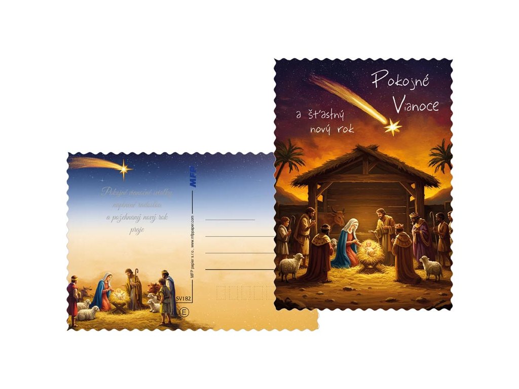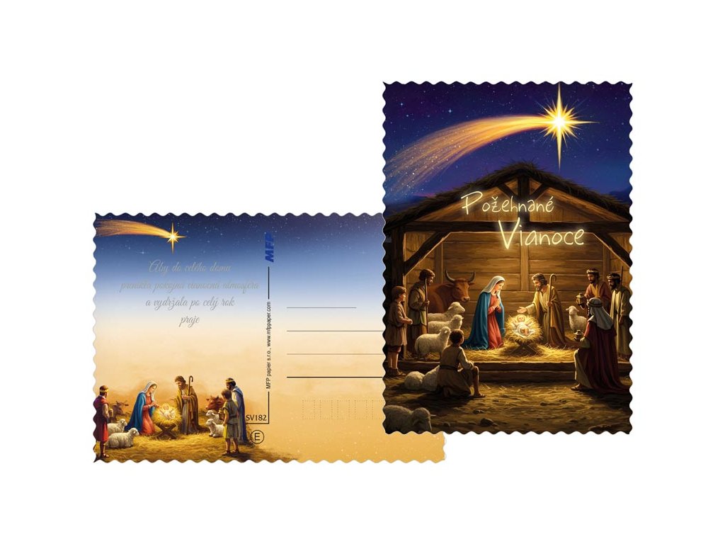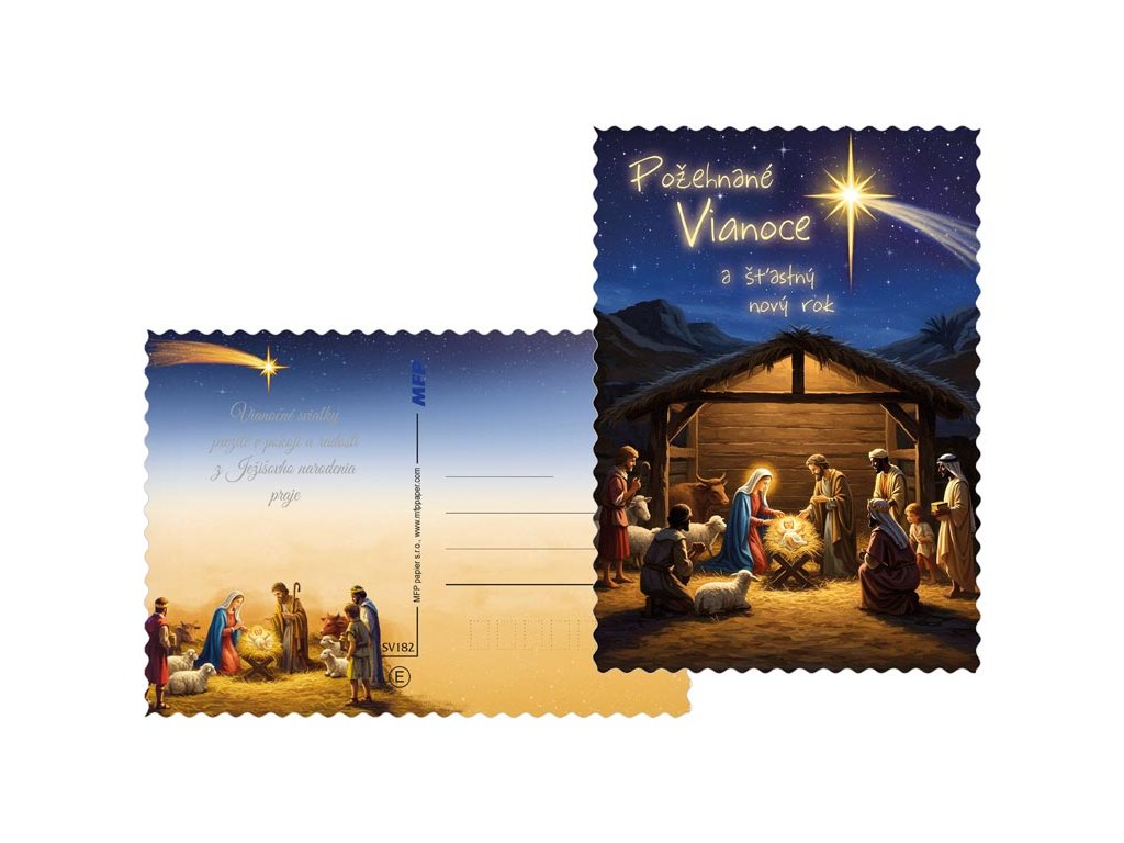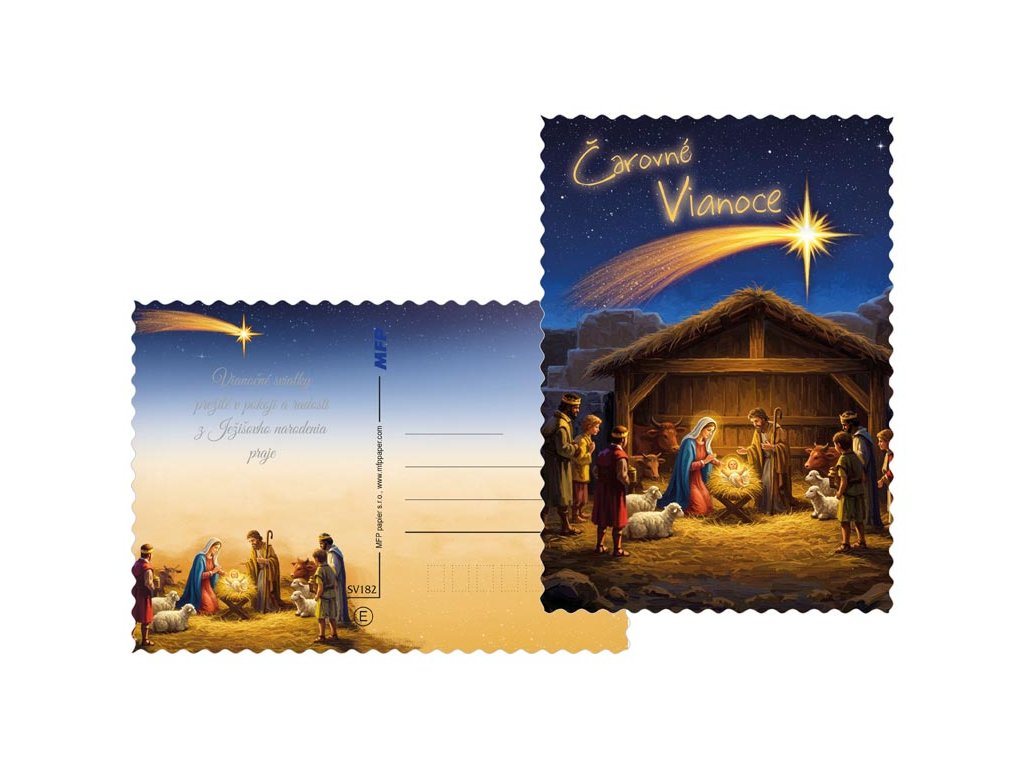 Zaželajte požehnané Vianoce! Zaželajte požehnané a pokojné Vianoce tradičnou pohľadnicou s nádherným betlehemským motívom. Ilustrácie Svätej rodiny pri jasličkách pod nočnou oblohou vytvárajú dojímavú atmosféru skutočných Vianoc. Ideálna na zaslanie srdečného pozdravu, ktorý poteší a prinesie do sviatkov skutočné vianočné posolstvo. Text na prednej strane: Veselé Vianoce, Čarovné Vianoce, Pokojné Vianoce a šťastný nový rok, Požehnané Vianoce a šťastný nový rok, Požehnané Vianoce, Krásne Vianoce Text na zadnej strane: Pohľadnica 1: Pokojné vianočné sviatky naplnené radosťou a požehnaný nový rok praje Pohľadnica 2: Vianočné sviatky prežité v pokoji a radosti z Ježišovho narodenia praje Pohľadnica 3: Pokojné vianočné sviatky naplnené radosťou a požehnaný nový rok praje Pohľadnica 4: Pokojné vianočné sviatky naplnené radosťou a požehnaný nový rok praje Pohľadnica 5: Vianočné sviatky prežité v pokoji a radosti z Ježišovho narodenia praje Pohľadnica 6: Aby do celého domu prenikla pokojná vianočná atmosféra a vydržala po celý rok praje Text: 6/6 Papier: pohľadnicový kartón 240 g Povrchová úprava: výsek + UV lak + gliter Dodávame v mixe 6 motívov podľa skladových zásob. Uvedená cena je za 1 ks.Dodatočné parametre