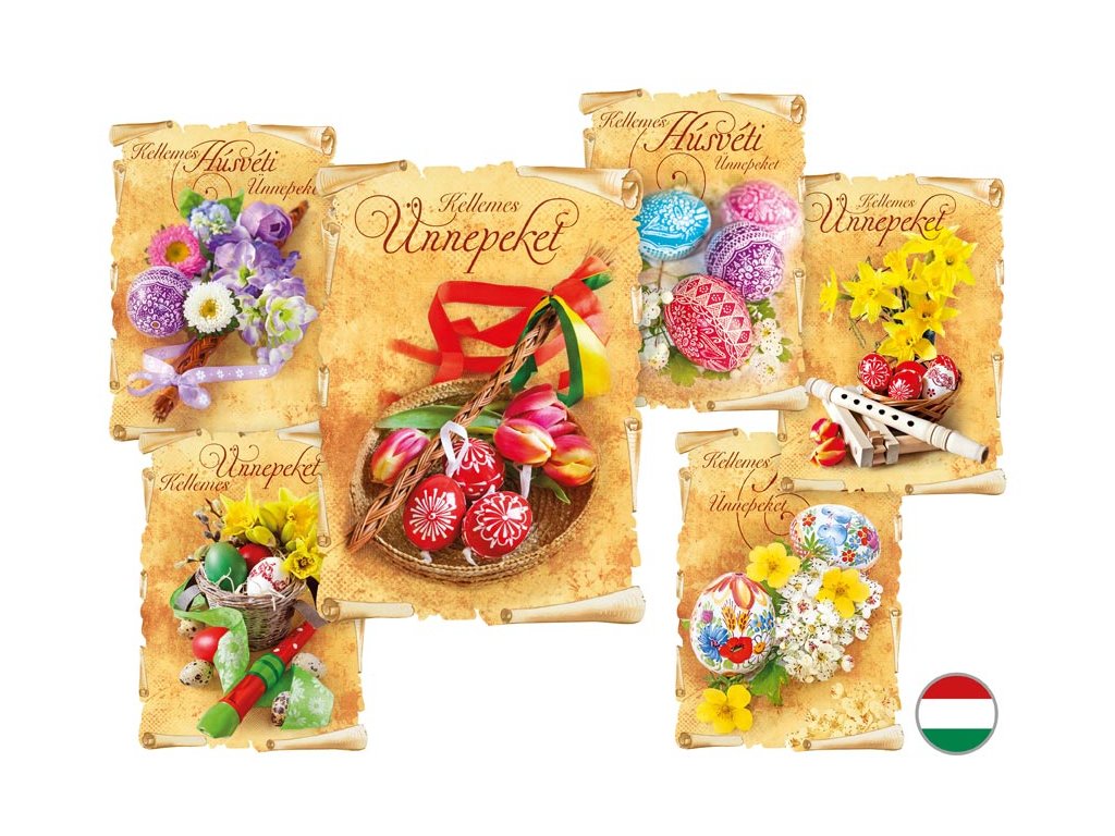Veľkonočná pohľadnica s maďarským textom. Text na zadnej strane obsahuje 6 pohľadníc zo 6. Papier: pohľadnicový kartón 240 g Povrchová úprava: s výsekom Text: 6/6 Dodáváme v mixu po 6 ks dle skladové zásoby. Uvedená cena je za 1 ks.Dodatočné parametre