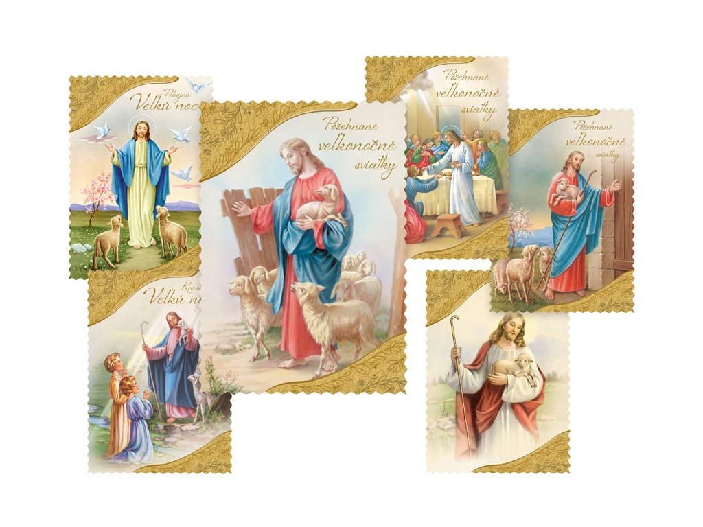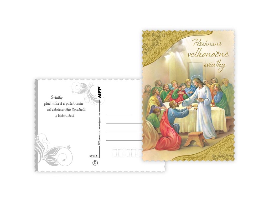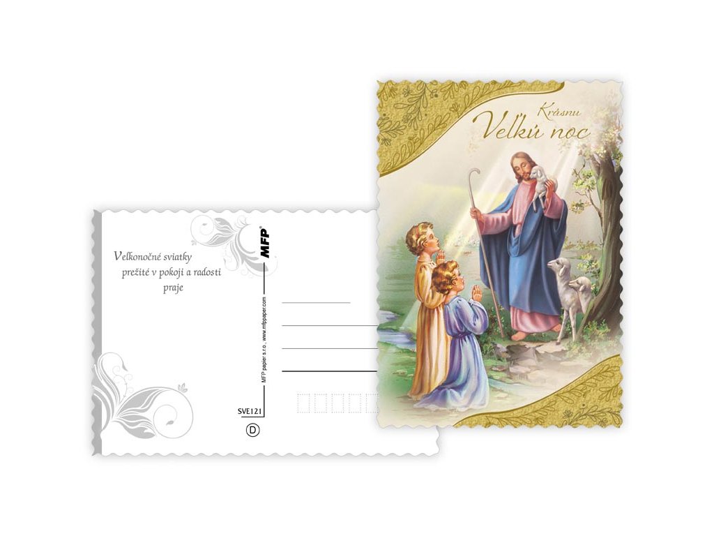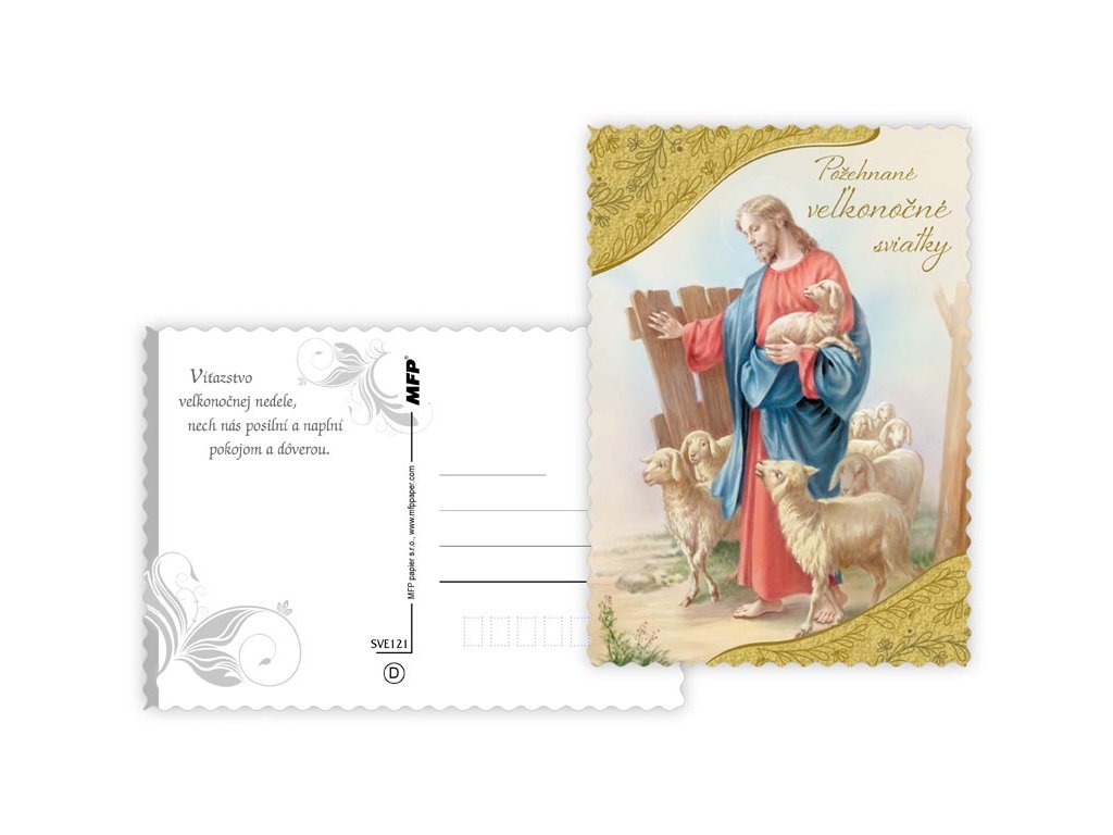 SK pohľadnica veľkonočné s vlnitým rámom. Text na zadnej strane obsahuje 6 pohľadníc zo 6. Text na prednej strane: Pokojnú Veľkú noc, Požehnané veľkonočné sviatky, Radostnú Veľkú noc, Krásnu Veľkú noc Text na zadnej strane: Pohľadnice 1: Víťazstvo veľkonočnej nedele, nech nás posilní a naplní pokojom a dôverou. Pohľadnice 2: Požehnané veľkonočné sviatky, nádej z Kristovho víťazstva, hojnosť zdravia a sily vyprosuje. Pohľadnice 3: Sviatky plné milosti a požehnania od vzkrieseného Spasiteľa s láskou praje. Pohľadnice 4: Vo svetle tohto radostného posolstva nech je slávenie Veľkej Noci prameňom nádeje, radosti a pokoja. Pohľadnice 5: Veľkonočné sviatky a prežité v pokoji a radosti praje. Pohľadnice 6: Milostiplné a požehnané veľkonočné sviatky, hojnosť zdravia, šťastia a lásky praje. Papier: pohľadnicový kartón 240 g Povrchová úprava: UV lak s výsekom Text: 6/6 Dodáváme v mixu po 6 ks dle skladové zásoby. Uvedená cena je za 1 ks.Dodatočné parametre
