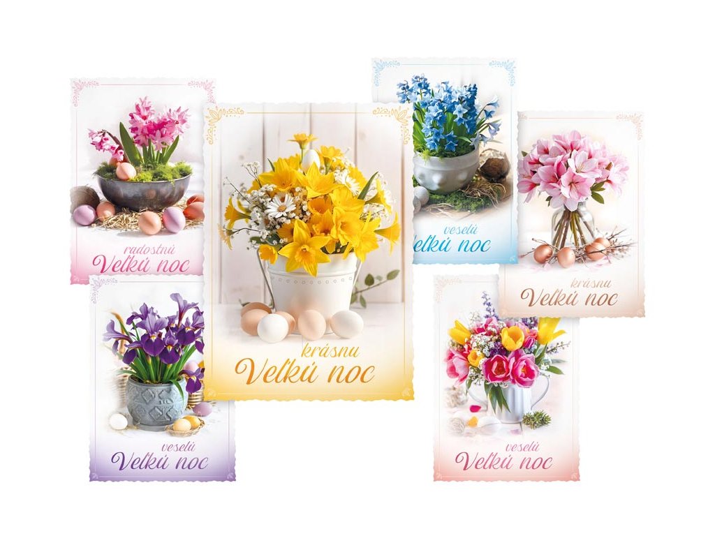 Oslávte Veľkú noc štýlovo s týmito pôvabnými pohľadnicami, ktoré žiaria sviežosťou jarnej prírody! K dispozícii je pestrý mix piatich kvetinových motívov, z ktorých každý prináša jedinečnú atmosféru – od jemných narcisov až po žiarivé tulipány. Táto pohľadnica je skvelým spôsobom, ako popriať svojim blízkym krásnu Veľkú noc. každého, kto ju dostane. Text na prednej strane: Radostnú Veľkú noc, Veselú Veľkú noc, Krásnu Veľkú noc, Veselú Veľkú noc, Krásnu Veľkú noc, Veselú Veľkú noc Text na zadnej strane: Pohľadnica 1: Krásnu Veľkú noc a príjemné prežitie sviatkov jari Pohľadnica 2: Krásne prežitie veľkonočných sviatkov a bohatú výslužku zo srdca praje Pohľadnica 3: Radostné prežitie veľkonočných sviatkov zo srdca praje Pohľadnica 4: Veľkonočné sviatky prežité v pokoji a radosti praje Pohľadnica 5: Veľkonočné sviatky prežité v pokoji a radosti praje Pohľadnica 6: V radosti a harmónii prežité jarné sviatky a veľa radosti z prvých jarných lúčov praje Text: 6/6 Papier: pohľadnicový kartón 240 g Povrchová úprava: výsek + UV lak Dodávame v mixe po 6 ks podľa skladovej zásoby. Uvedená cena je za 1 ks.Dodatočné parametre