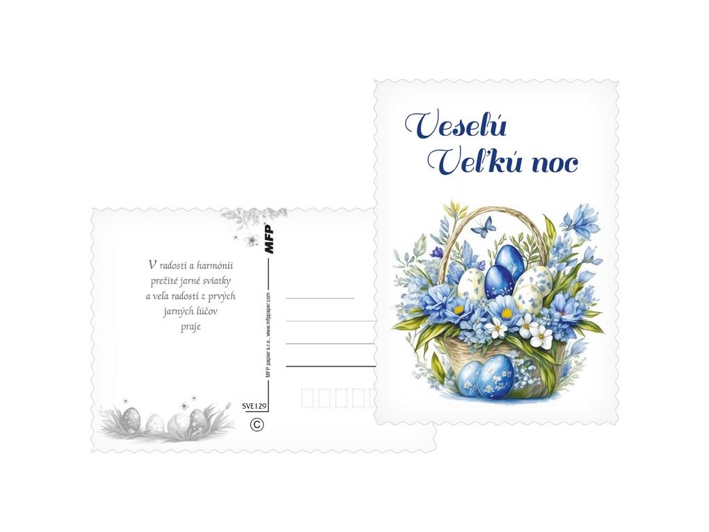 Prineste kúzlo jari priamo do schránky! Tieto nádherné veľkonočné pohľadnice sú ako stvorené na zdieľanie radosti, jarnej energie a sviatočnej nálady. Každá pohľadnica je ako drobný kúsok jarnej lúky – plná jemných kvetov, žiarivých kraslíc a veselých motívov, ktoré vám vykúzlia úsmev na tvári. Pošlite svojim blízkym krásne prianie, ktoré hovorí: Jar je tu a myslím na teba! Text na prednej strane: Radostnú Veľkú noc, Veselú Veľkú noc, Krásnu Veľkú noc, Veselú Veľkú noc, Krásnu Veľkú noc, Radostnú Veľkú noc Text na zadnej strane: Pohľadnica 1: Radostné prežitie veľkonočných sviatkov zo srdca praje Pohľadnica 2: V radosti a harmónii prežité jarné sviatky a veľa radosti z prvých jarných lúčov praje Pohľadnica 3: Veľkonočné sviatky prežité v pokoji a radosti praje Pohľadnica 4: Krásne prežitie veľkonočných sviatkov a bohatú výslužku zo srdca praje Pohľadnica 5: Krásnu Veľkú noc a príjemné prežitie sviatkov jari Pohľadnica 6: Radostnú Veľkú noc a príjemnú jarnú náladu praje Text: 6/6 Povrchová úprava: výsek Papier: pohľadnicový kartón 240 g Dodávame v mixe po 6 ks podľa skladovej zásoby. Uvedená cena je za 1 ks.Dodatočné parametre