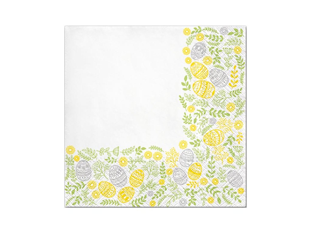 Papierový veľkonočný obrúsok. Servítky s pestrým lemom jarných kvetov a vajíčok sú štýlovým doplnkom vášho veľkonočného stola. Servítka je vyrobená z kvalitného trojvrstvového papiera. Vhodné aj na obrúskovú techniku. MOTÍV: obruba kvetov s vajíčkami POČET OBRÚSKOV V BALENÍ: 20 ks Uvedená cena je za 1 balenie po 20 ks.Dodatočné parametre