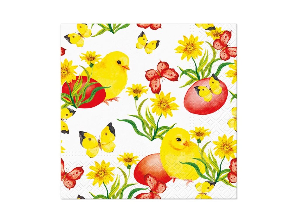 Papierový veľkonočný obrúsok. Krásne veľkonočné obrúsky s obrázkami kuriatok, kvetov, motýľov a veľkonočných vajíčok dodajú prestretému stolu nádych jari a vyčarujú príjemnú atmosféru pri slávnostnom obede alebo večeri. Obrúsok je vyrobený z kvalitného trojvrstvového papiera. Vhodné aj na obrúskovú techniku a rôzne dekorácie. Motív: kuriatka, kvety, motýle, veľkonočné vajíčka POČET OBRÚSKOV V BALENÍ: 20 ks Uvedená cena je za 1 balenie po 20 ks.Dodatočné parametre