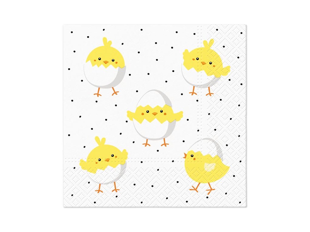 Papierový veľkonočný obrúsok. Krásne veľkonočné obrúsky s obrázkami kuriatok v škrupinke dodajú prestretému stolu nádych jari a vyčarujú príjemnú atmosféru pri slávnostnom obede alebo večeri. Obrúsok je vyrobený z kvalitného trojvrstvového papiera. Vhodné aj na obrúskovú techniku a rôzne dekorácie. MOTÍV: kuriatka v škrupinke POČET OBRÚSKOV V BALENÍ: 20 ks Uvedená cena je za 1 balenie po 20 ks.Dodatočné parametre