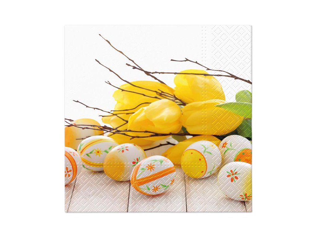 Papierový veľkonočný obrúsok. Krásne veľkonočné obrúsky s obrázkami veľkonočných vajíčok a tulipánov dodajú prestretému stolu nádych jari a vyčarujú príjemnú atmosféru pri slávnostnom obede alebo večeri. Obrúsok je vyrobený z kvalitného trojvrstvového papiera. Vhodné aj na obrúskovú techniku a rôzne dekorácie. MOTÍV: veľkonočné vajíčka, tulipány POČET OBRÚSKOV V BALENÍ: 20 ks Uvedená cena je za 1 balenie po 20 ks.Dodatočné parametre