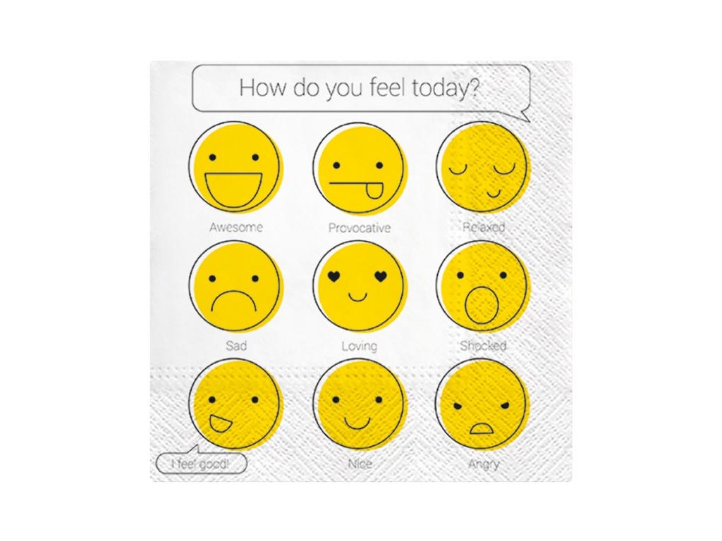 Trojvrstvový papierový obrúsok. Krásne kvalitné obrúsky s motívom smajlíkov na bielom pozadí a nápisom "Ako sa dnes cítite" vyčarujú príjemnú atmosféru. Ideálne na záhradné prestieranie, oslavy alebo na výzdobu interiéru. MOTÍV: smajlíci POČET OBRÚSKOV V BALENÍ: 20 ks Uvedená cena je za 1 balenie po 20 ks.Dodatočné parametre