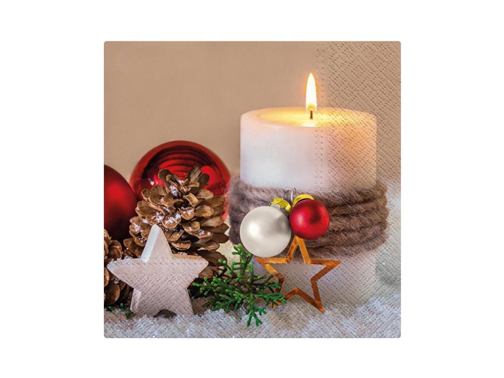 Papierový vianočný obrúsok s motívom sviečky a ozdôb. Je vyrobený z kvalitného trojvrstvového papiera. Tento obrúsok je ideálny na vianočné stolovanie, kde motív zapálenej sviečky spolu s tradičnými ozdobami vytvorí hrejivú, útulnú atmosféru. Vhodný na slávnostné večere alebo sviatočné stretnutia s rodinou a priateľmi. MOTÍV: sviečka, vianočné ozdoby POČET OBRÚSOK V BALENÍ: 20 ks Uvedená cena je za 1 balenie po 20 ks.Dodatočné parametre