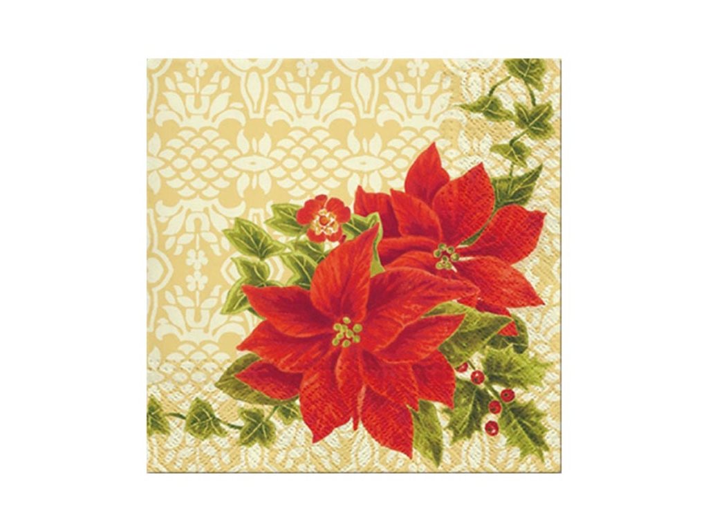 Vianočný obrúsok s motívom vianočnej hviezdy Vianočný obrúsok prinesie do vášho domova tú pravú sviatočnú atmosféru. Tradičný motív červenej vianočnej hviezdy (poinsettie) v kombinácii so zelenými lístkami a jemným vzorom krásne doplní každé slávnostné prestieranie. Obrúsok je vyrobený z kvalitného trojvrstvového papiera. Je ideálny na vianočnú večeru, rodinné oslavy aj posedenia s priateľmi, kde podčiarkne čaro sviatočnej chvíle. Vďaka svojmu dizajnu nájde uplatnenie aj pri kreatívnom tvorení – hodí sa na decoupage, scrapbooking alebo výrobu originálnych dekorácií. Rozmer: 33 × 33 cm Motív: vianočná hviezda Počet obrúskov v balení: 20 ks Uvedená cena je za 1 balenie (20 kusov).Dodatočné parametre