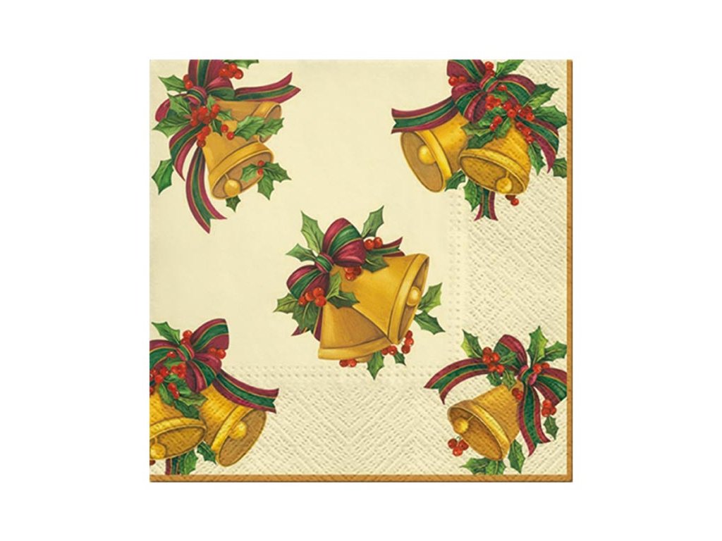 Vianočný obrúsok so zlatými zvončekmi Vianočný obrúsok je krásnym doplnkom sviatočného stolovania. Motív tradičných vianočných zvončekov so zelenými lístkami cezmíny, červenými bobuľkami a farebnou stuhou prinesie do vášho domova čaro adventného času. Obrúsok je vyrobený z kvalitného trojvrstvového papiera, ktorý zabezpečuje vyššiu odolnosť. Skvele poslúži pri decoupage, scrapbookingových projektoch alebo výrobe originálnych dekorácií, kde vynikne jeho detailný vianočný motív. Motív: zvončeky Rozmer: 33 × 33 cm Počet obrúskov v balení: 20 ks Uvedená cena je za 1 balenie (20 kusov).Dodatočné parametre