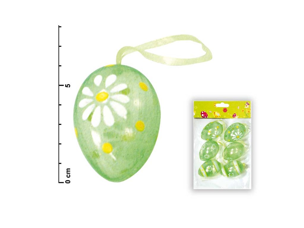 Balenie obsahuje 6 kusov plastových vajíčok. Veľkosť vajíčka je 6 cm. Vajíčka sú priehľadné, zelené a zdobené bielymi kvetmi. Každé vajíčko má šnúrku na zavesenie.Dodatočné parametre