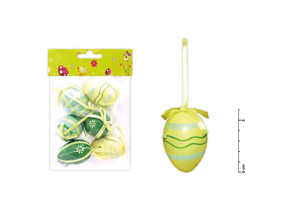 Balenie obsahuje 6 kusov plastových vajíčok. Veľkosť vajíčka je 6 cm. Vajíčka sú žltozelené a zdobené. Každé vajíčko má šnúrku na zavesenie. Uvedená cena je za 1 balenie.Dodatočné parametre