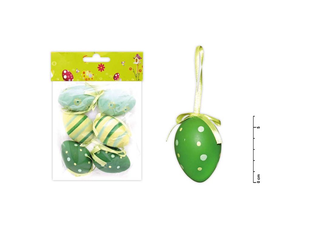 Balenie obsahuje 6 kusov plastových vajíčok. Veľkosť vajíčka je 6 cm. Vajíčka sú zdobené žltou a zelenou farbou. Každé vajíčko má šnúrku na zavesenie. Uvedená cena je za 1 balenie.Dodatočné parametre
