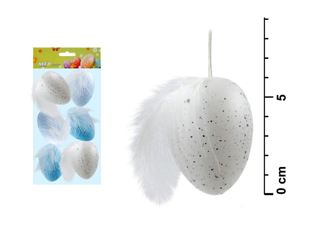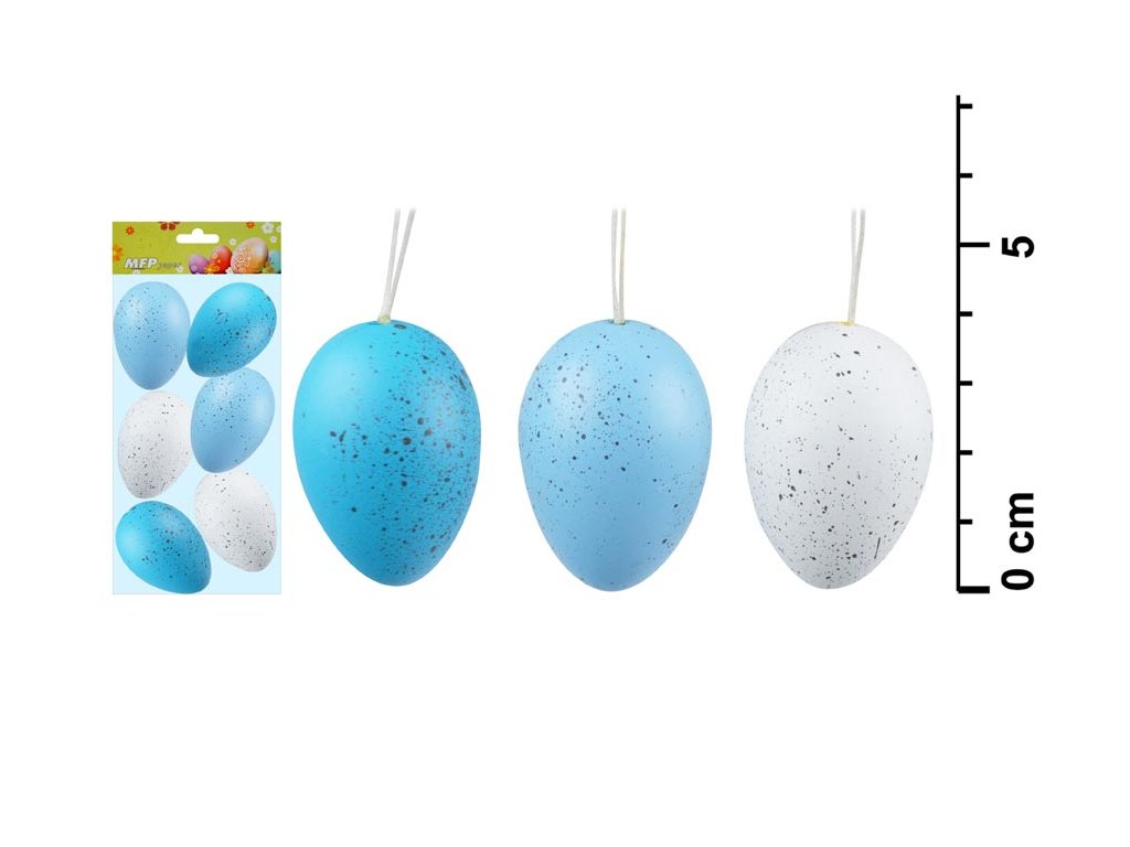 Veľkonočné plastové vajíčka s malými škvrnami, v bielej a modrej farbe. Vajíčka majú povrázok na zavesenie. Vyzdobte si svoj domov krásnymi veľkonočnými vajíčkami, ktoré Vám vytvoria očarujúcu atmosféru Veľkej noci! Túto dekoráciu môžete použiť na dekorovanie veľkonočných vencov alebo vetvičiek. BALENIE OBSAHUJE: - 6 ks plastových vajíčok Veľkosť: 60 mm Farba: biela, odtiene modrej Dodávame v sáčku so závesom. Uvedená cena je za 1 balenie.Dodatočné parametre