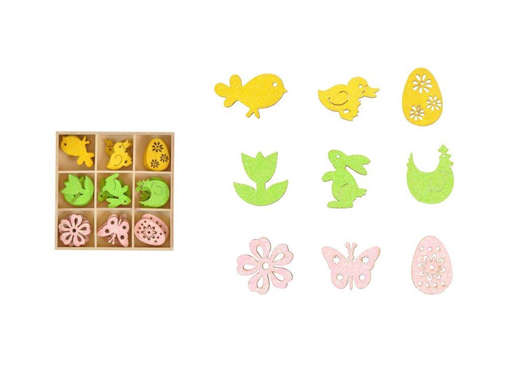 Drevené veľkonočné dekorácie. Vyzdobte si byt veľkonočnými dekoráciami a privítajte tak sviatky jari. Tieto drevené dekorácie môžu byť použité na dekorovanie veľkonočných vencov, košíkov, vetvičiek a pod. BALENIE OBSAHUJE: -27 ks veľkonočných farebných dekorácií (9 motívov) Veľkosť: 3 cm Dodávame v drevnej škatuli. Uvedená cena je za 1 balenie.Dodatočné parametre