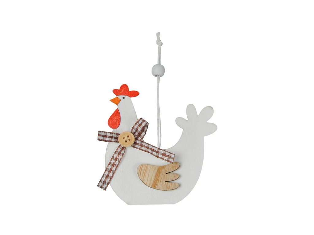 Krásna veľkonočná dekorácia v dizajne drevenej bielej sliepočky so závesom, poslúži ako dekorácia do exteriéru alebo na skrášlenie interiéru. Dekorácia má povrázok na zavesenie. Veľkosť: 90 mm Uvedená cena je za 1 ks.Dodatočné parametre