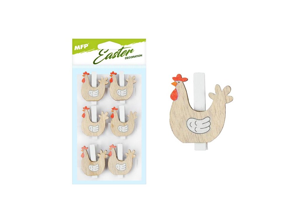Štipce v dizajne drevených sliepok slúžia ako krásna dekorácia do exteriéru alebo na skrášlenie interiéru. Balenie obsahuje: - 6 ks štipcov (sliepky) Dodávame vo vrecku so závesom. Uvedená cena je za 1 balenie.Dodatočné parametre