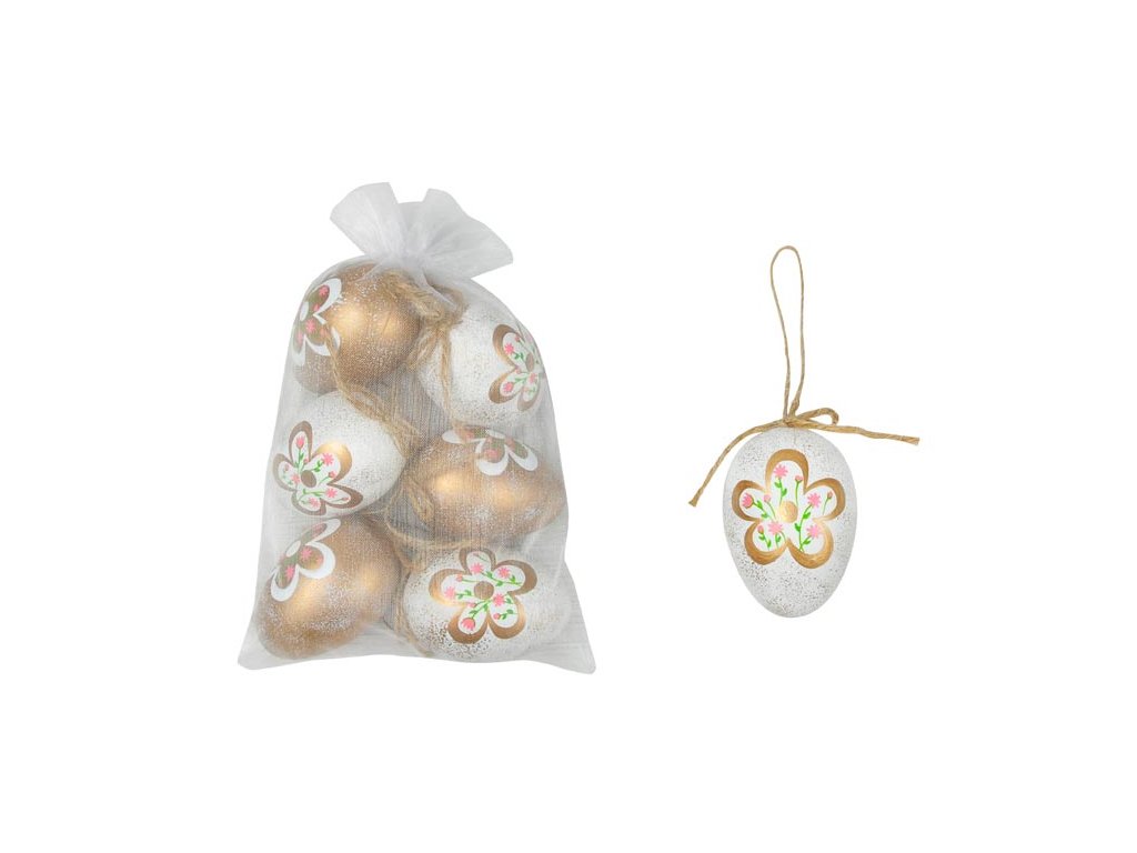 Plastové vajíčka v bielozlatej farbe na zavesenie. Krásna veľkonočná dekorácia z posypaných veľkonočných vajíčok so zavesením, slúži ako dekorácia do exteriéru alebo interiéru. Nalaďte sa s nami na Veľkú noc! Balenie obsahuje: - 6 ks dekorácií (vajíčka) Veľkosť: 6 cm Dekorácia má šnúrku na zavesenie. Uvedená cena je za 1 balenie.Dodatočné parametre