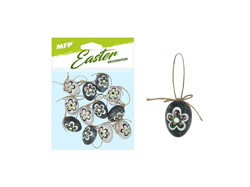 Plastové vajíčka v čiernobielej farbe na zavesenie. Krásna veľkonočná dekorácia z maľovaných veľkonočných vajíčok so zavesením, slúži ako dekorácia do exteriéru alebo interiéru. Nalaďte sa s nami na Veľkú noc! Balenie obsahuje: - 12 ks dekorácií (vajíčok) Veľkosť: 4 cm Dekorácia má šnúrku na zavesenie. Uvedená cena je za 1 balenie.Dodatočné parametre