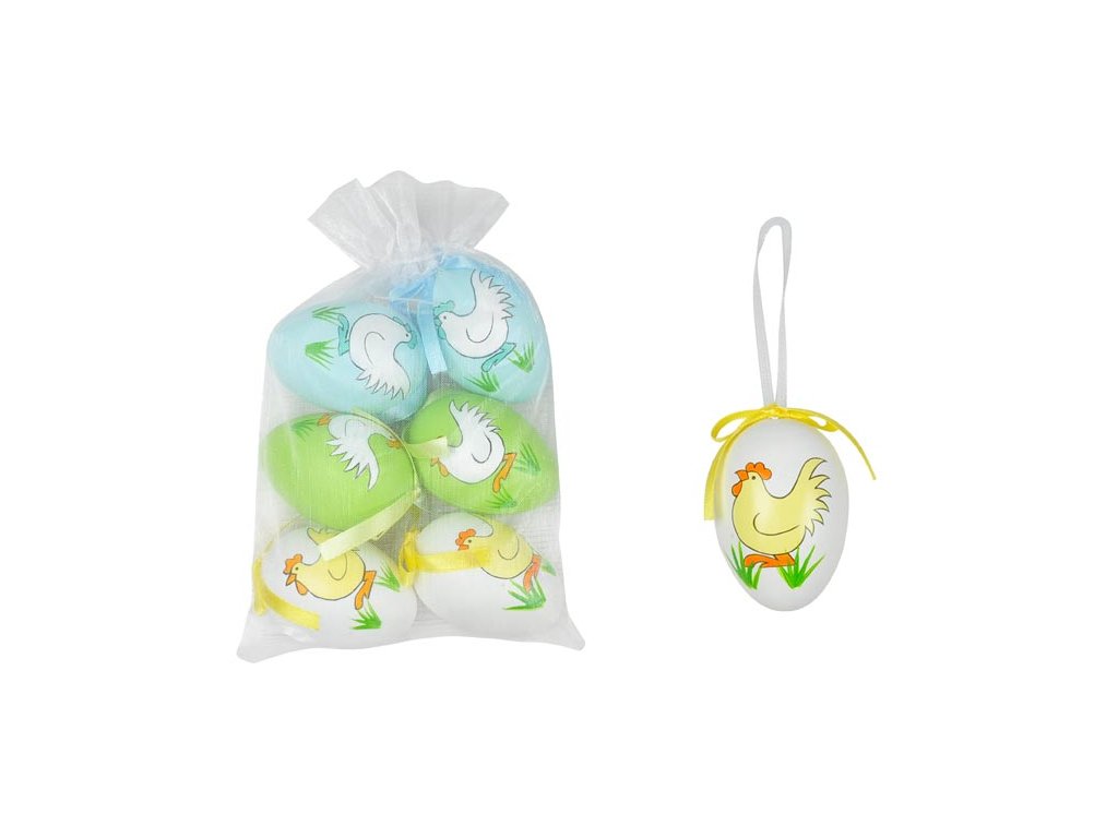 Plastové vajíčka v jarných farbách na zavesenie. Krásna veľkonočná dekorácia z farebných vajíčok so sliepočkou a stuhou na zavesenie poslúži ako dekorácia do exteriéru alebo interiéru. Nalaďte sa s nami na Veľkú noc! Balenie obsahuje: - 6 ks dekorácií (vajíčka) Veľkosť: 6 cm Dekorácia má šnúrku na zavesenie. Uvedená cena je za 1 balenie.Dodatočné parametre