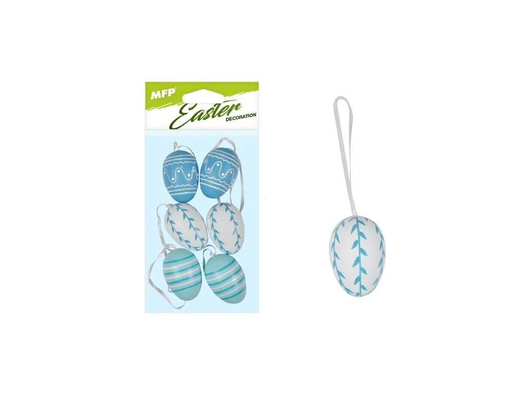 Plastové vajíčka v modrobielej farbe na zavesenie. Krásna veľkonočná dekorácia z maľovaných veľkonočných vajíčok so zavesením, slúži ako dekorácia do exteriéru alebo interiéru. Nalaďte sa s nami na Veľkú noc! Balenie obsahuje: - 6 ks dekorácií (vajíčka) Veľkosť: 6 cm Dekorácia má šnúrku na zavesenie. Uvedená cena je za 1 balenie.Dodatočné parametre