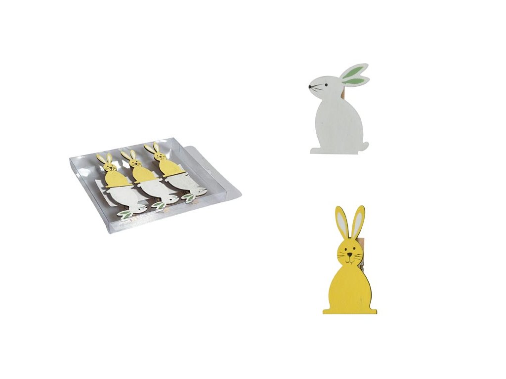 Štipce v dizajne drevených zajačikov, poslúži ako krásna dekorácia do exteriéru alebo na skrášlenie interiéru. BALENIE OBSAHUJE: - 6 ks štipcov (3 žlté zajace, 3 biele zajace) Veľkosť: 5 mm Balené v plastovej krabičke. Uvedená cena je za 1 balenie.Dodatočné parametre
