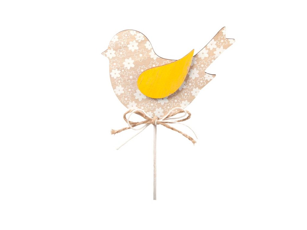 Drevený zápich vtáčik v krémovej farbe. Vtáčik má žlté krídielko a je zdobený bielymi kvetmi. Zápich je ideálnym doplnkom do vašich jarných kvetináčov alebo kvetov vo váze. Farba: krémová Materiál: preglejka Celková dĺžka zápichu: 310 mm Uvedená cena je za 1 ks.Dodatočné parametre