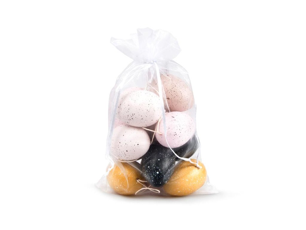 Plastové vajíčka kropenaté v rôznych farbách na zavesenie. Krásna dekorácia veľkonočných vajíčok so zavesením, slúži ako dekorácia do exteriéru alebo interiéru. Dekorácia má šnúrku na zavesenie. Vajíčka sú uložené v sťahovacom sáčku z organzy. Nalaďte sa s nami na Veľkú noc! Balenie obsahuje: - 12 dekorácií (vajíčok) Veľkosť: 6 cm Dodávame v sáčku z organzy. Uvedená cena je za 1 balenie.Dodatočné parametre
