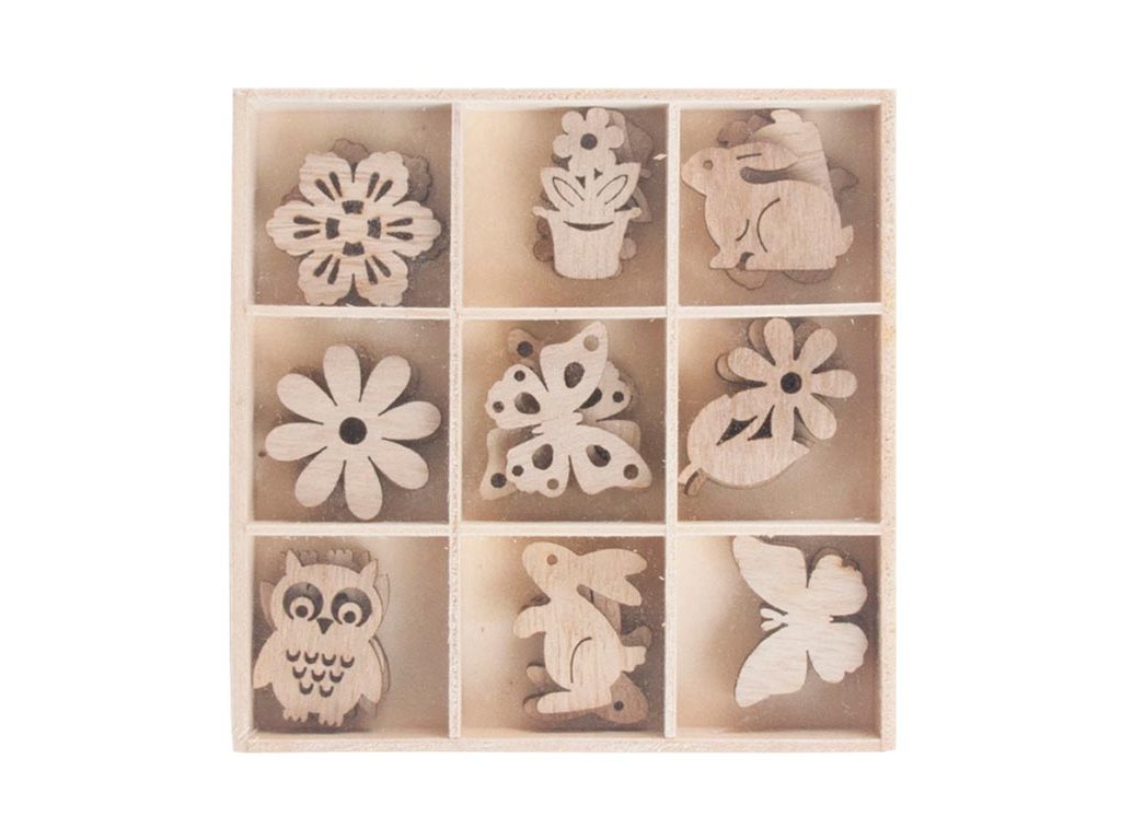Veľkonočná drevená dekorácia v prírodnej farbe v kombinácii motívov. Plánujete si užiť pohodové popoludnie a vyzdobiť si dom alebo záhradu na privítanie jari? Potom vám nesmú chýbať tieto krásne dekorácie v podobe rôznofarebných srdiečok. Dekorácie môžete použiť na aranžovanie veľkonočných vencov alebo vetvičiek. Vyrobené z preglejky. Obsah balenia: - 27 ks dekorácií Veľkosť: 25 mm Materiál: drevo Farba: prírodná Motív: kvetina, zajac, sova Dodávame v drevenej škatuľke. Uvedená cena je za 1 balenie.Dodatočné parametre