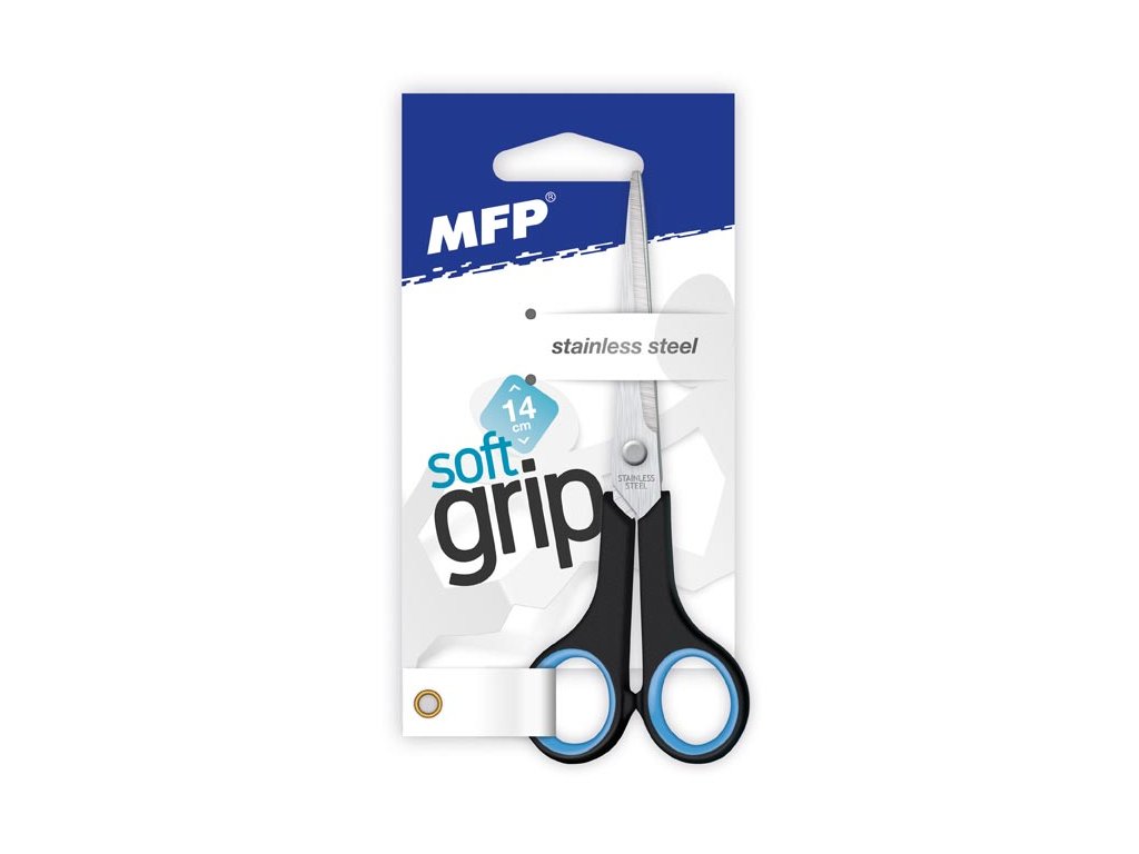 Nožnice vhodné do školy, do kancelárie, ale aj pre domácnosť. Ostrie je vyrobené z tvrdenej, nehrdzavejúcej ocele. Rukoväť je ergonomicky tvarovaná a opatrená technológiou SOFT GRIP, ktorá zabraňuje šmýkaniu. Dĺžka ostria od stredu nitu: 65 mm Farebné vyhotovenie: čierno-modré Dodávame so závesom. Uvedená cena je za 1 ks.Dodatočné parametre