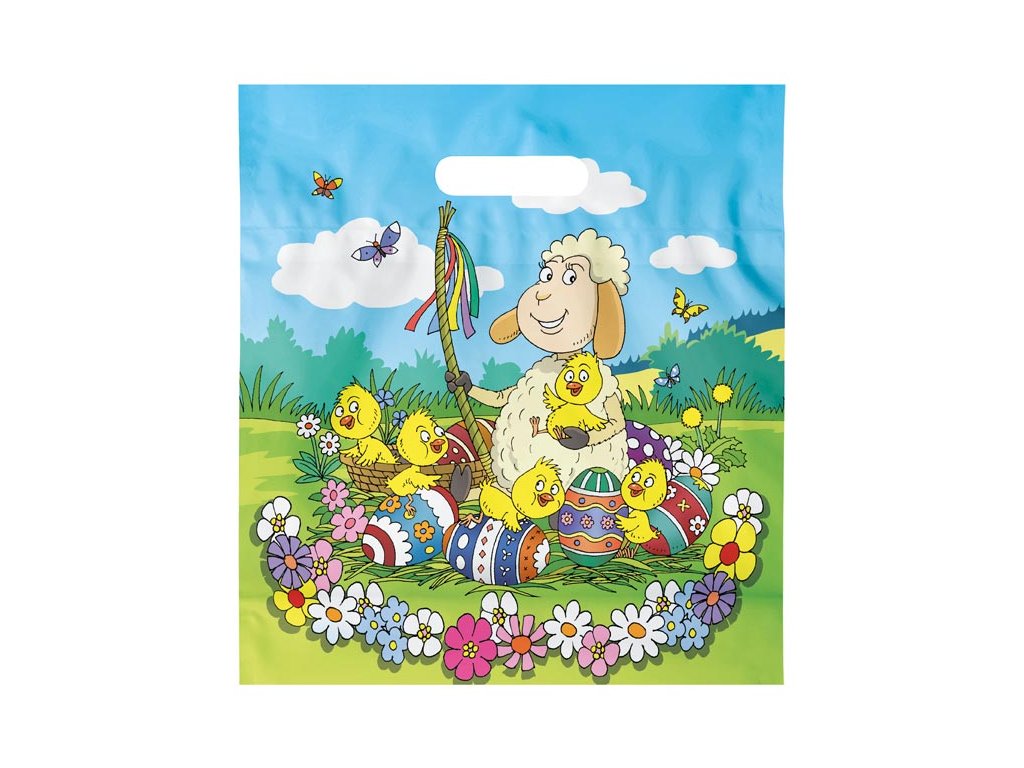 Igelitová taška s prehmatom s veľkonočným motívom ovečky, veľkonočných vajíčka a kuriatok. Ideálna pre vytváranie čokoládových balíčkov pre deti. Tlač: 4 + 0cmyk Materiál: Polyetylén Hrúbka materiálu: 0,045 my Rozmer: 295 x 320 x 80 mm Uvedená cena je za 1 ks.Dodatočné parametre