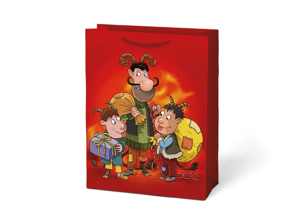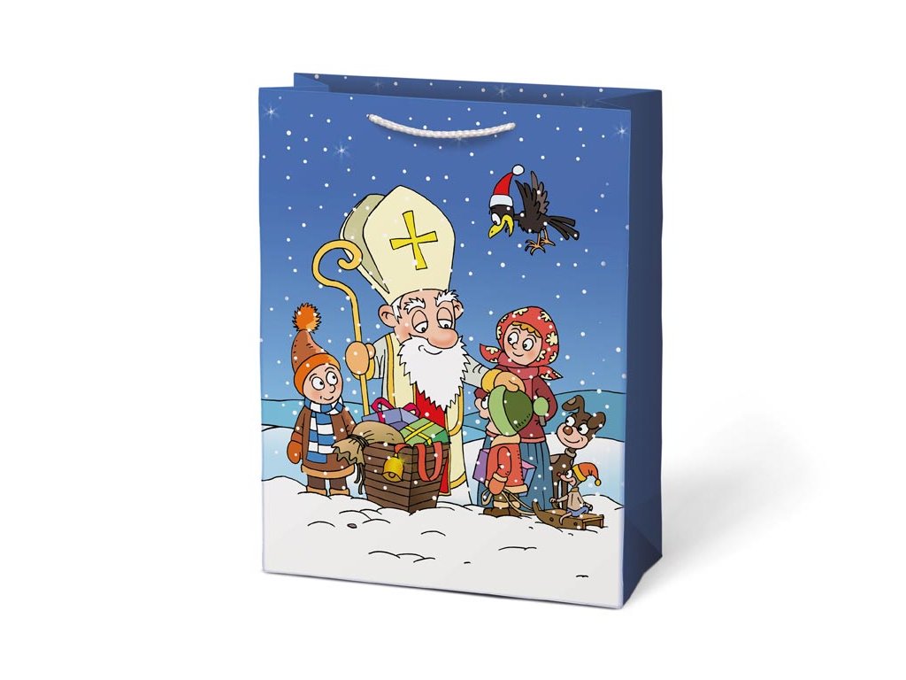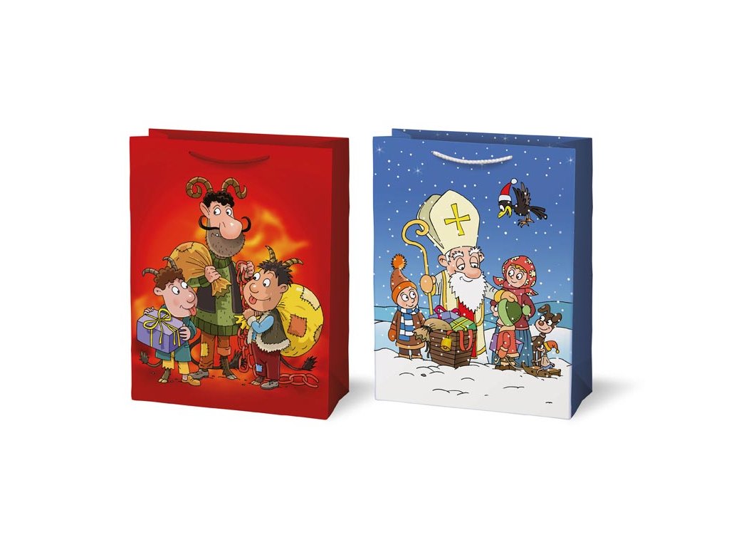Papierová, vianočná, darčeková taška s motívom Mikuláše. Taška má pevné ucho na ľahké prenášanie a štítok na vpísanie mena alebo priania. Povrchová úprava: Lak Rozmery: 260 x 340 x 140 mm Dodávame v mixe po 2 ks podľa skladových zásob. Uvedená cena je za 1 ks.Dodatočné parametre