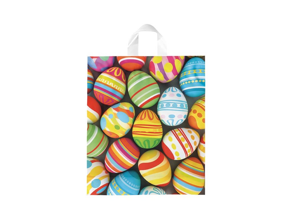 Celoplošne potlačená igelitová taška s motívom veľkonočných vajíčok a s privareným uchom. Sila igelitky: 0,050 mmDodatočné parametre