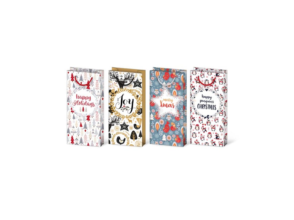 Papierová, darčeková taška s vianočnými Disney motívmi a nápismi „happy Holidays, Joe, merry Xmas, happy penguins Christmas“ – vodná na fľašku vína. Taška má pevné ucho pre ľahšie prenášanie a štítok na napísanie mena či priania. Gramáž: 157 g Povrchová úprava: Lak Rozmer: 100 x 220 x 55 mm Dodávame v mixe po 4 ks podľa skladových zásob. Uvedená cena je za 1 ks.Dodatočné parametre