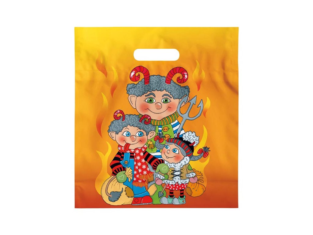 Igelitová taška s prehmatom v Mikulášskom motíve, ktorá je ideálna na zabalenie dobrôt, sladkostí a na ďalšiu mikulášsku nádielku pre deti. Na taške je obrázok troch čertov. Materiál: PE Rozměr: 295 x 320 x 80 mm Všetkých 100 ks je balených v sáčku. Uvedená cena je za 1 ks.Dodatočné parametre